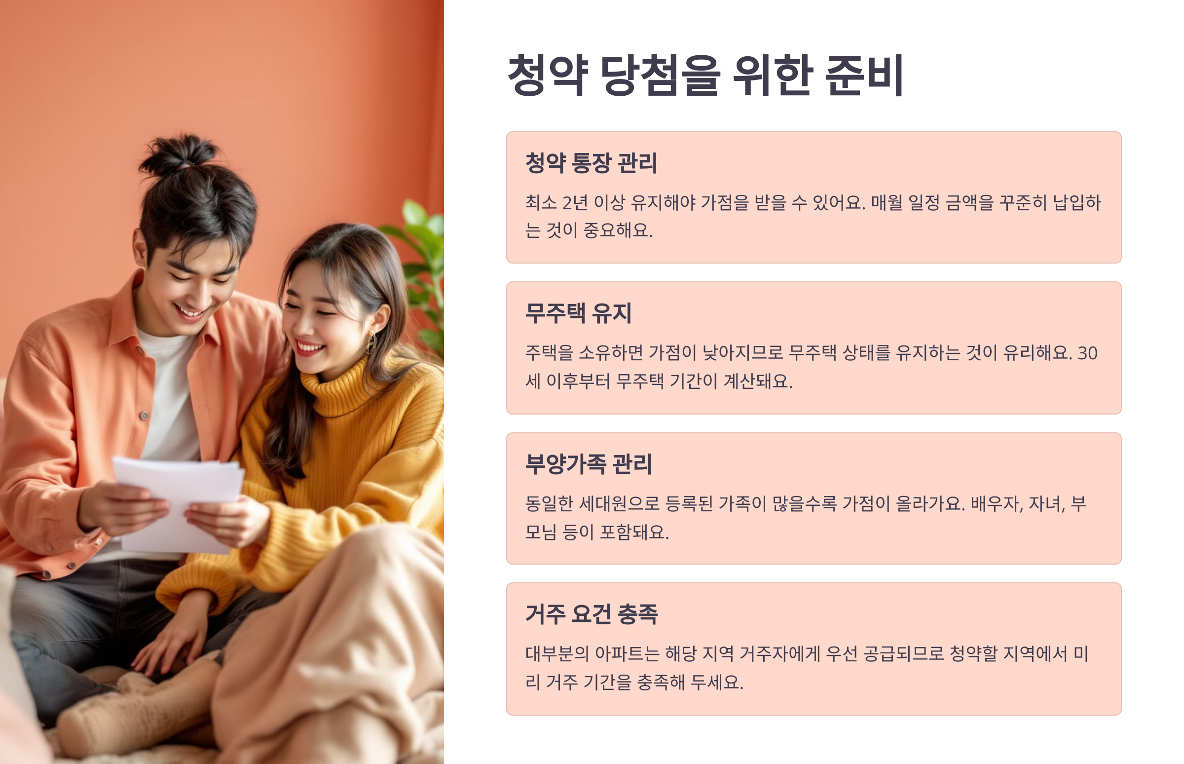 특히 청약 통장은 꾸준히 관리해야 하고, 무주택 기간과 부양가족 수를 최대한 활용하는 것이 중요해요.