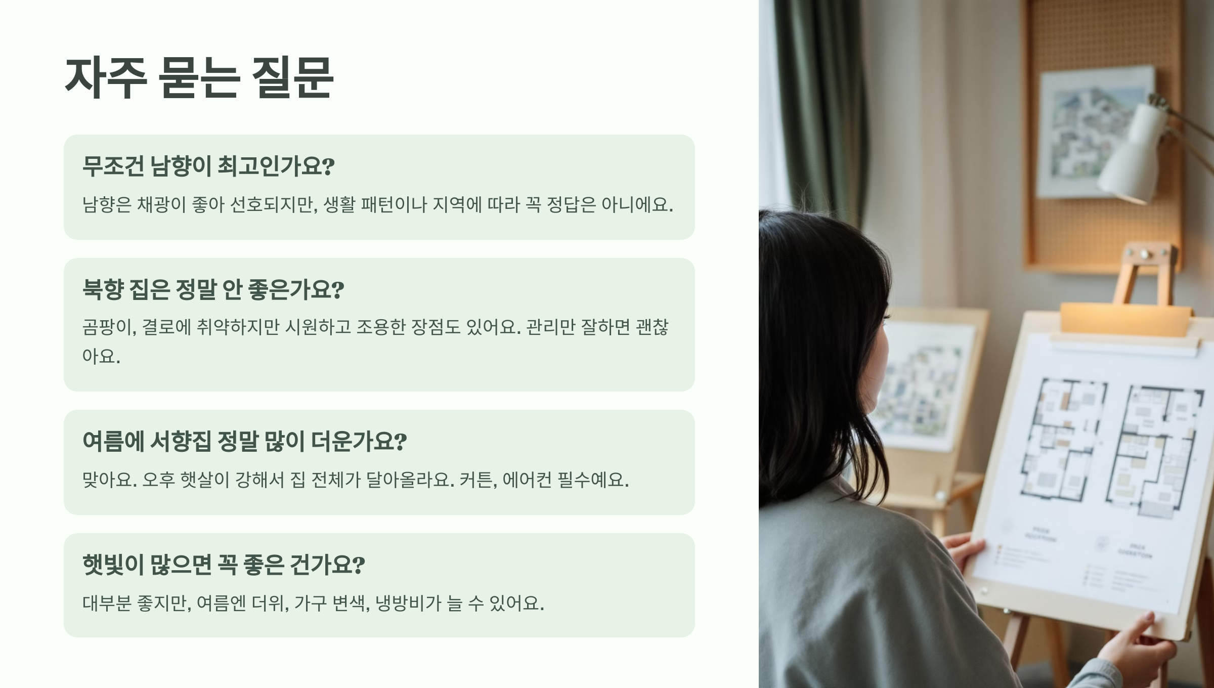 A1. 남향은 채광이 좋아 일반적으로 선호되지만, 개인의 생활 패턴이나 지역에 따라 꼭 정답은 아니에요.