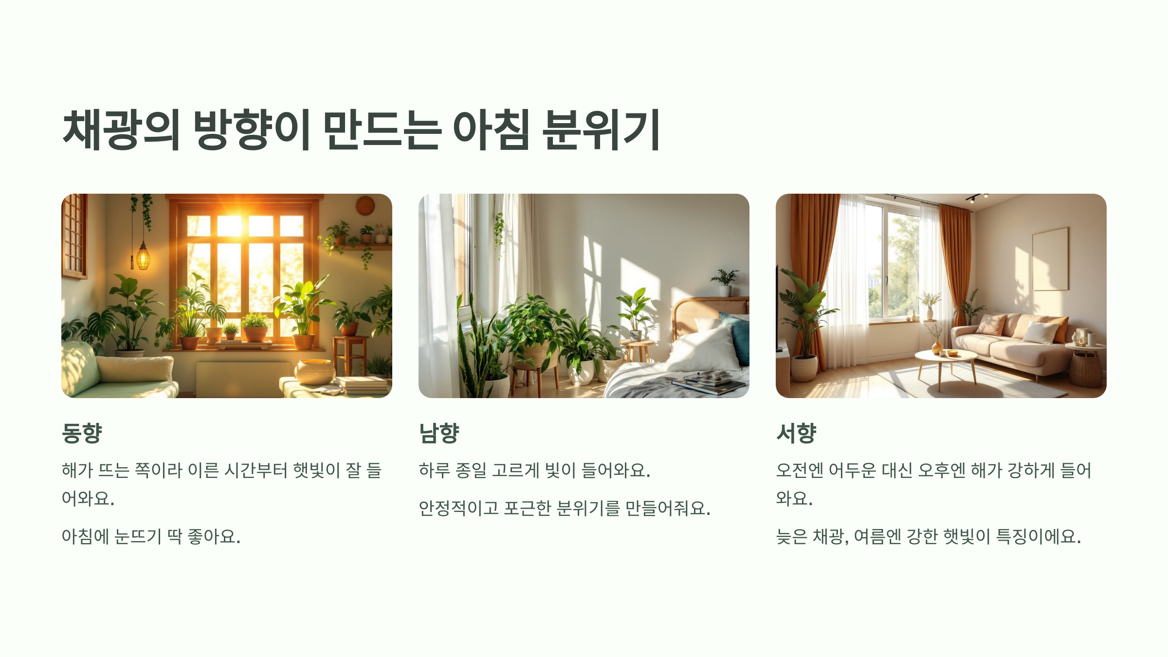 | 서향 | 오후 위주 | 늦은 채광, 여름엔 강함 |