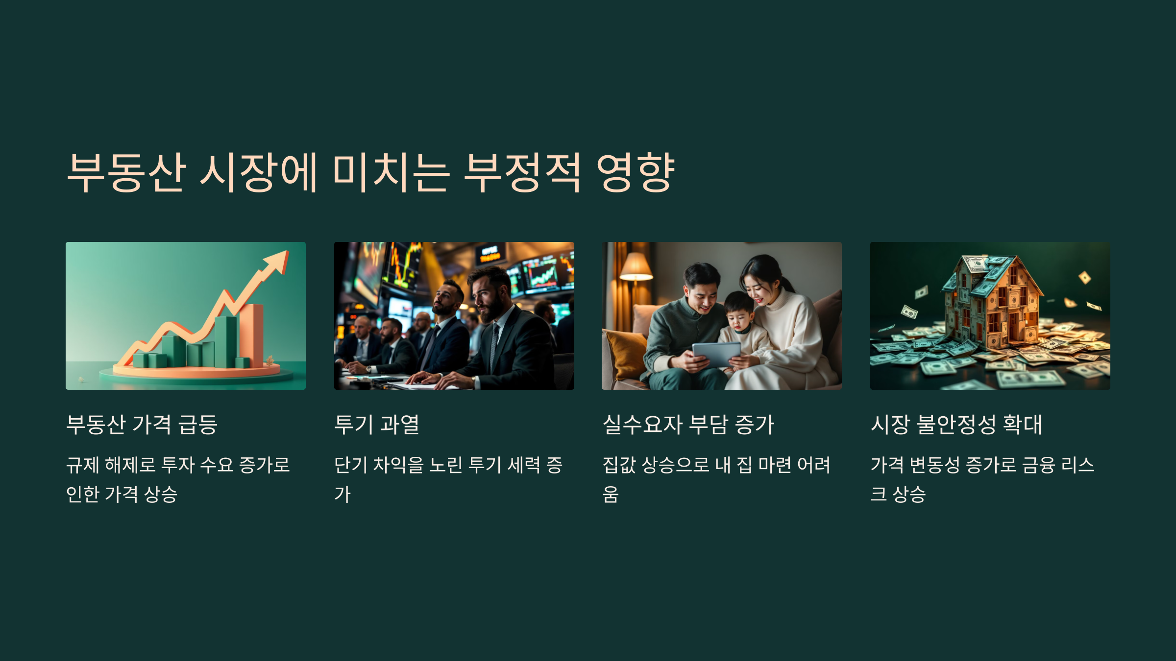 - 📈 부동산 가격 급등: 규제 해제로 인해 투자 수요가 몰리며 가격 상승
