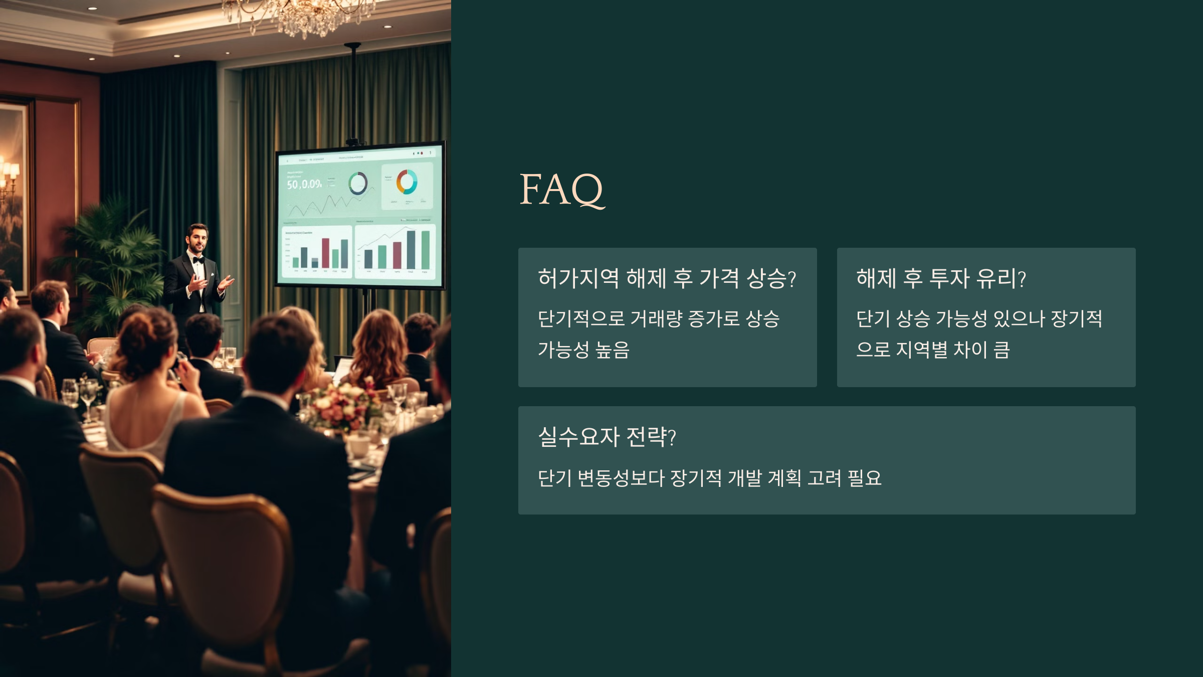 - ⚖️ 중장기적 변동성: 해제 지역별 개발 계획에 따라 차별화된 시장 형성