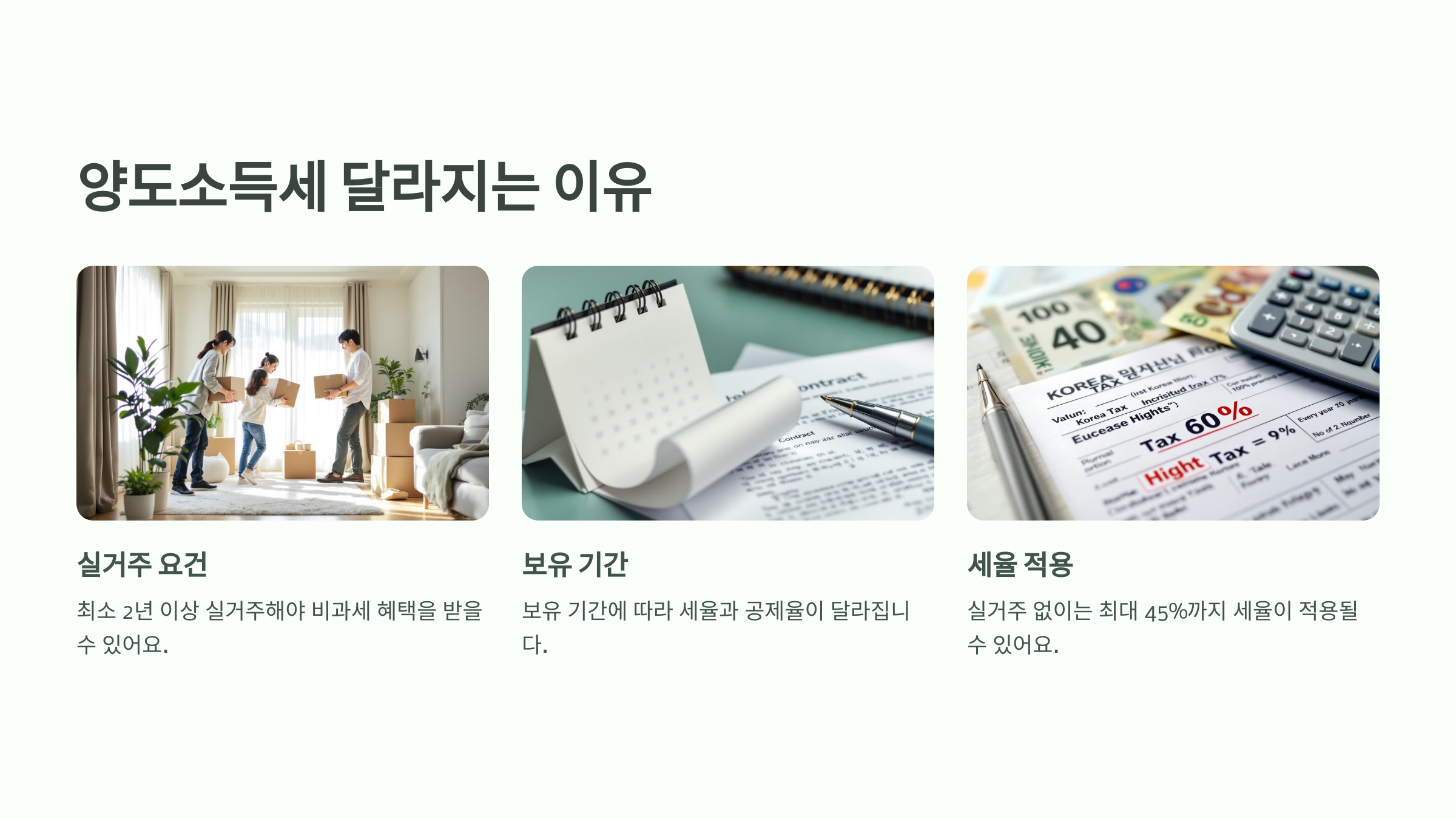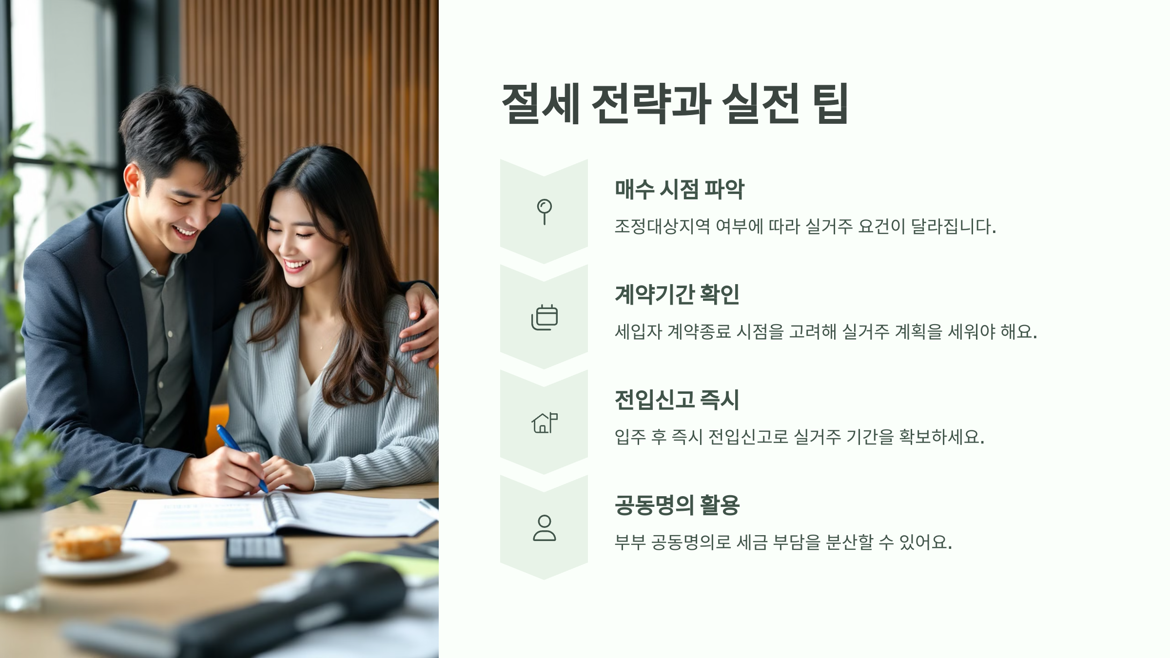 정리하면, 양도세를 줄이기 위해선 반드시 실거주 요건을 충족해야 하고, 그 시기를 세입자 계약과 맞물려 전략적으로 접근해야 해요.