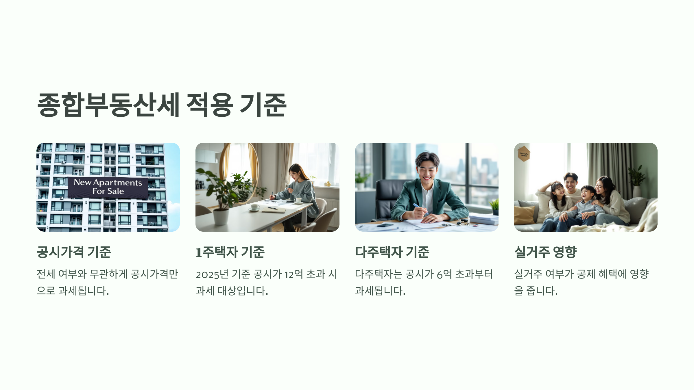 2025년 기준으로 1주택자는 공시가 12억 초과 시 과세 대상이고, 다주택자나 법인은 6억원 초과부터 해당돼요. 중요한 건 주택 수와 공시가예요.