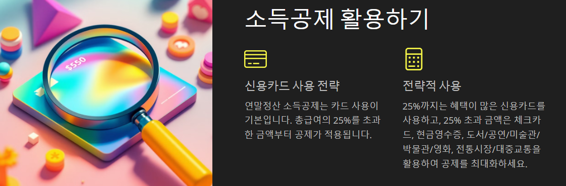연말정산 소득공제의 기본은 카드 사용입니다. 다만 총급여의 25%를 초과한 금액부터 공제가 적용되기 때문에 전략적으로 사용하는 것이 중요합니다.