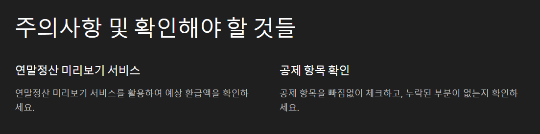 - 연말정산 미리보기 서비스를 활용하여 예상 환급액을 확인하세요.