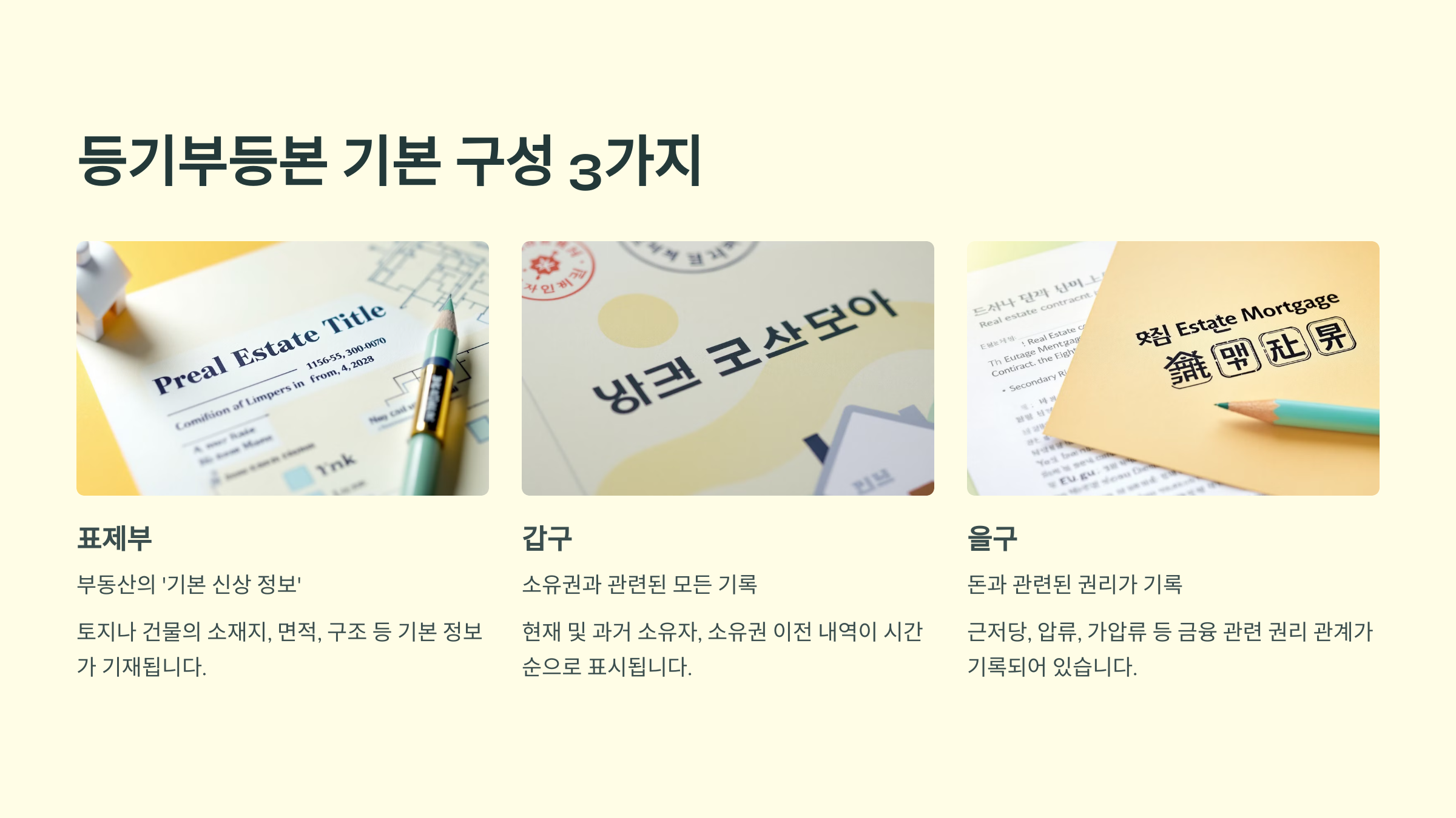 이제 다음은 등기부등본을 구성하는 3가지 핵심 파트 중, 전체 구조부터 차근차근 살펴볼게요. 👇 먼저 전체 구성을 한 번에 정리해보는 시간입니다!