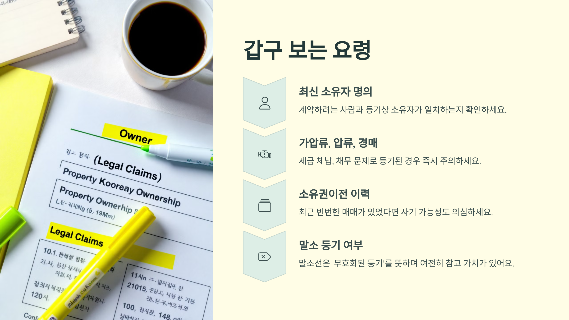 갑구를 통해 확인해야 할 핵심 항목은 아래와 같아요: 1️⃣ 최신 소유자 명의 – 계약하려는 사람과 등기상 소유자가 일치하는지 확인! 2️⃣ 가압류, 압류, 경매 – 세금 체납, 채무 문제로 등기된 경우 즉시 주의! 3️⃣ 소유권이전 이력 – 최근 빈번한 매매가 있었다면 사기 가능성도 의심! 4️⃣ 말소 등기 여부 – 말소선은 ‘무효화된 등기’를 뜻하며 여전히 참고 가치 있음.