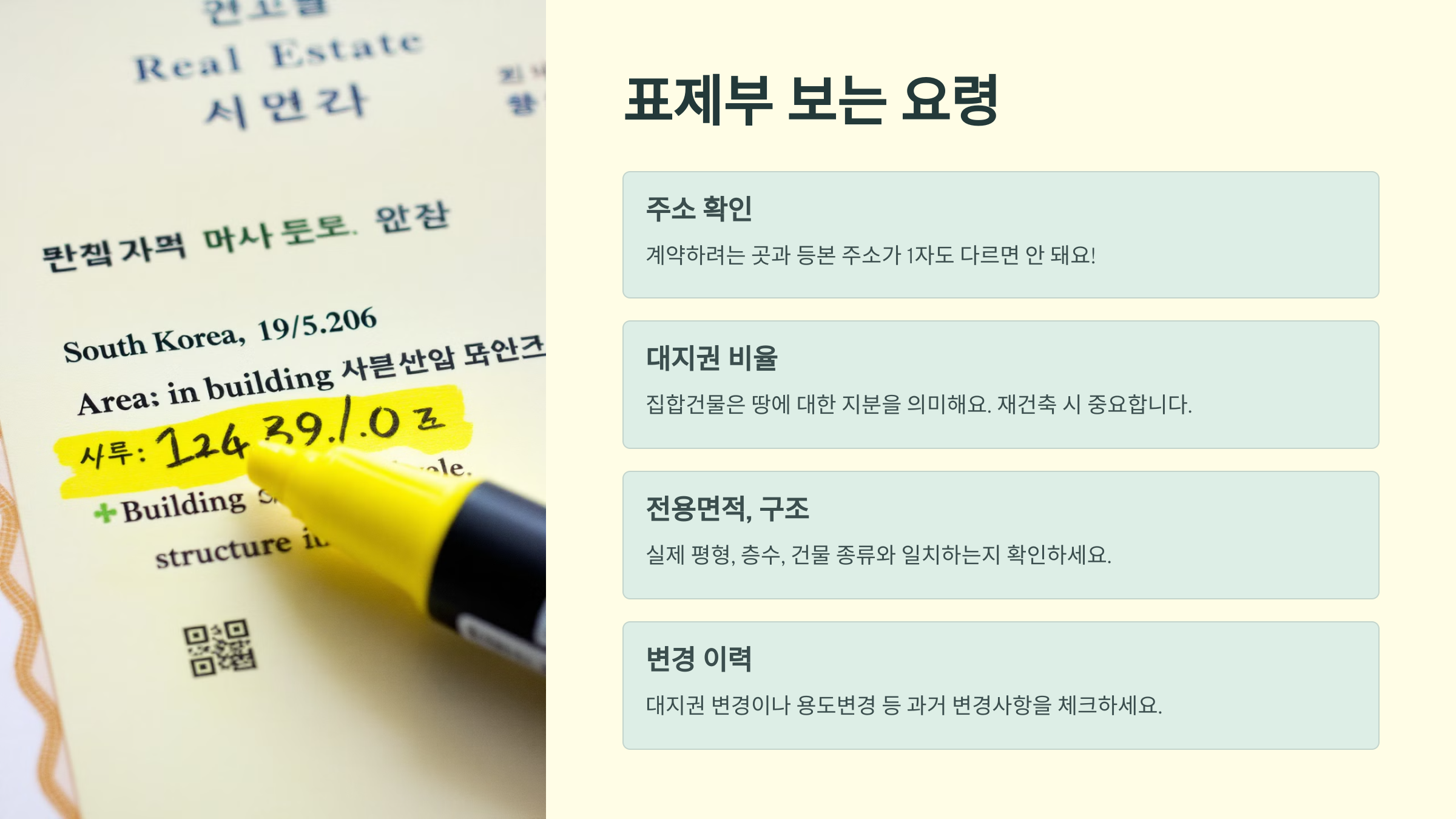 주요 확인 포인트는 아래 4가지예요: 1️⃣ 부동산의 정확한 주소 - 계약하려는 곳과 등본 주소가 1자도 다르면 안 돼요! 2️⃣ 대지권의 비율 - 집합건물(아파트, 오피스텔)은 땅에 대한 지분을 의미해요. 3️⃣ 전용면적, 건물 구조 - 실제 평형, 층수, 건물 종류와 일치하는지 확인. 4️⃣ 표제부 변경 이력 - 대지권 변경이나 용도변경 등 과거 변경사항 체크! 🧾