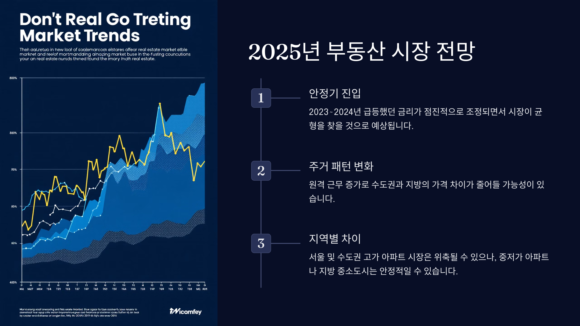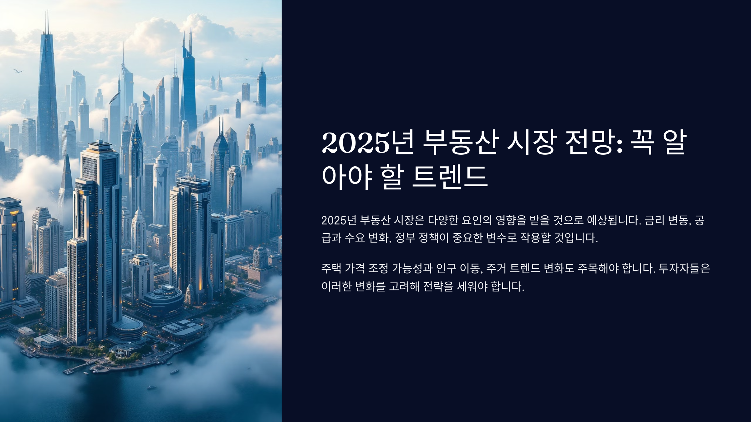 🏡 2025년 부동산 시장은 다양한 경제적, 정책적 요인의 영향을 받을 것으로 예상돼요. 금리 변동, 공급과 수요 변화, 정부의 정책 등이 중요한 변수로 작용할 거예요.
