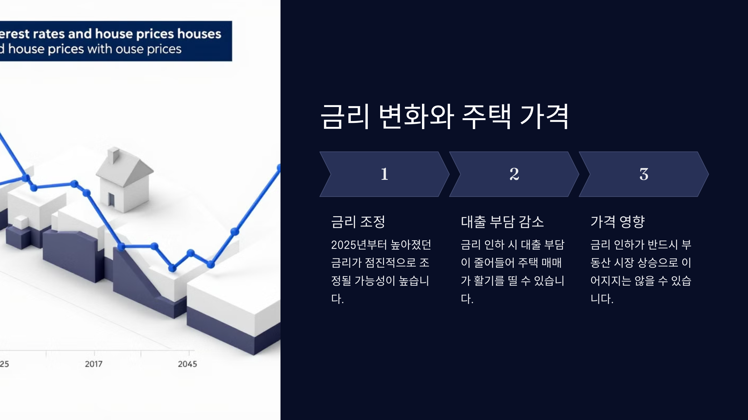 2025년 부동산 시장에서 가장 중요한 변수 중 하나는 금리 변화예요. 금리는 대출 이자율에 직접적인 영향을 주기 때문에, 주택 구매를 고려하는 사람들에게 큰 영향을 미치죠.