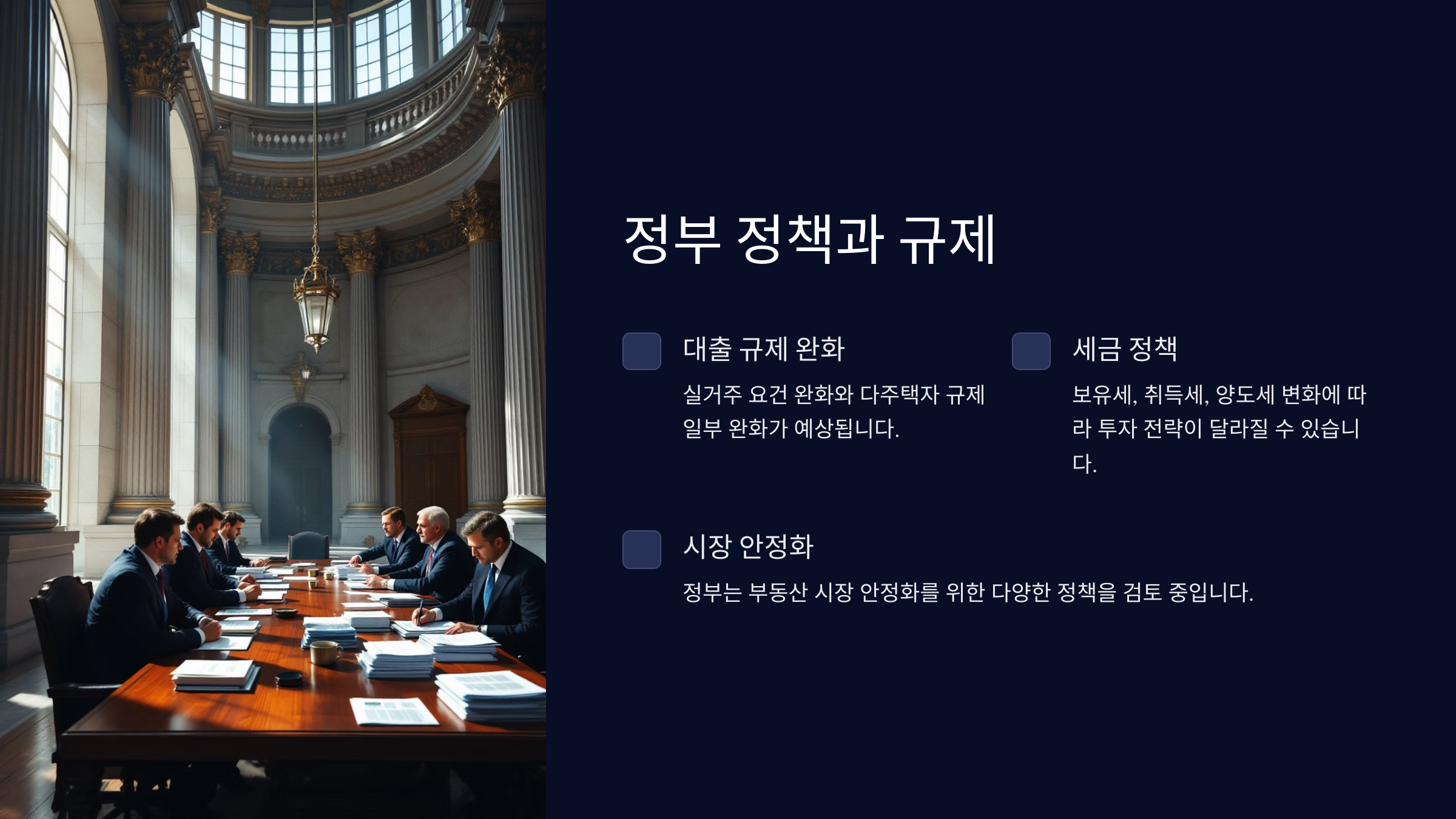 부동산 시장은 정부 정책에 큰 영향을 받아요. 2025년에는 대출 규제 완화, 보유세 조정 등의 변화가 예상돼요.