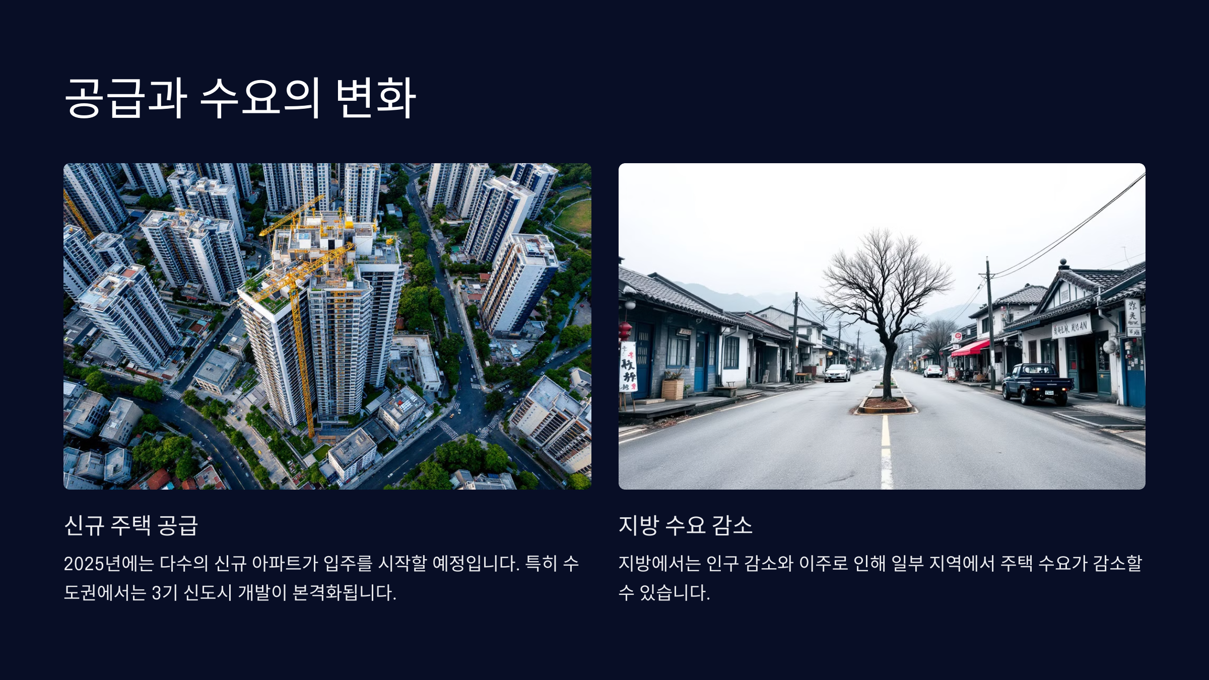 부동산 시장은 공급과 수요의 균형에 따라 가격이 결정돼요. 2025년에는 신규 주택 공급과 인구 구조 변화가 중요한 영향을 미칠 것으로 예상돼요.
