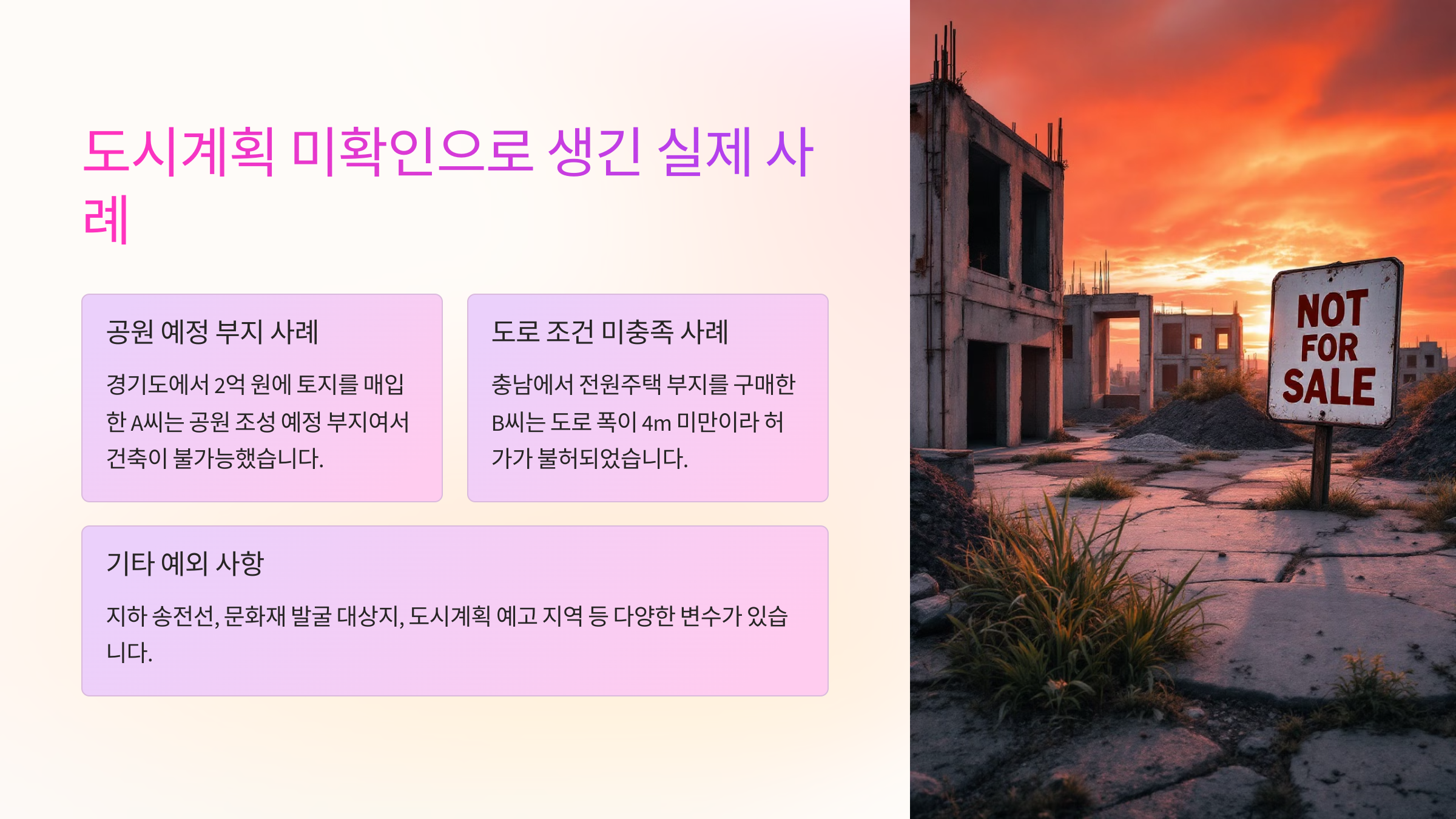 한 사례로, 경기도 모 지역에서 2억 원에 토지를 매입한 A씨는 단독주택을 지을 계획이었어요. 하지만 건축허가를 신청했더니 해당 지역이 ‘공원 조성 예정 부지’에 포함되어 있다는 사실을 뒤늦게 알게 되었어요. 결국 건축은 불가능했고, 해당 토지는 수년째 매도조차 어렵게 됐어요.