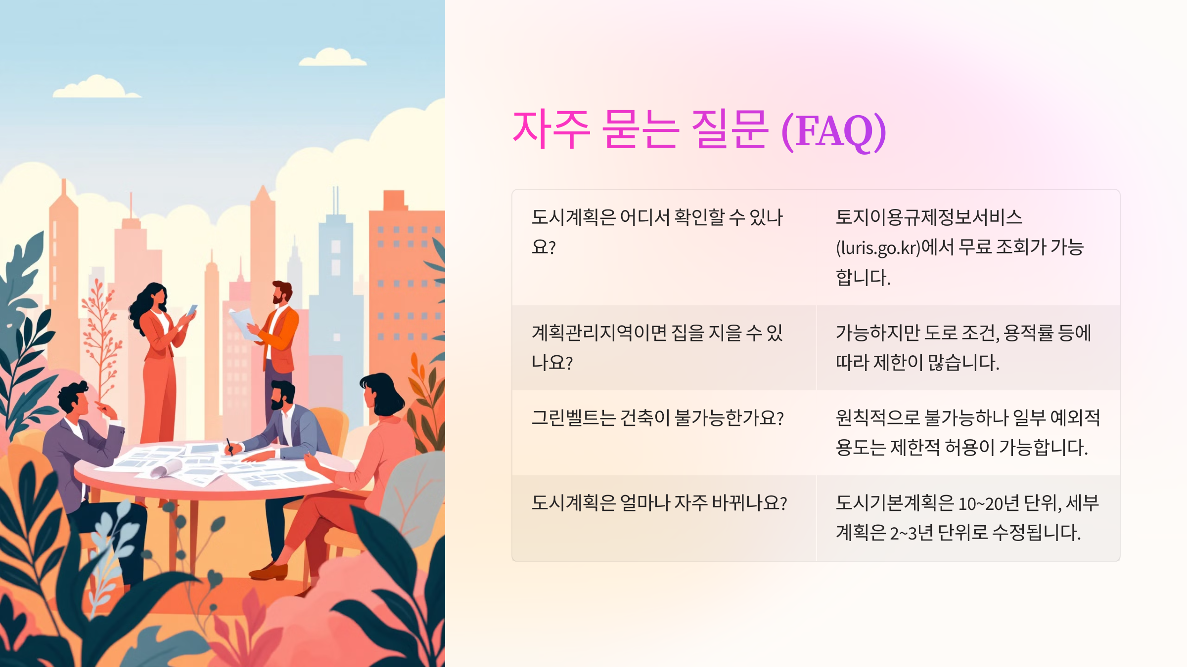 A6. 도시기본계획은 10~20년 단위로 수립되지만, 세부계획이나 지구단위계획은 2~3년 단위로 수시로 수정되기도 해요. 특히 도시 외곽이나 개발 예정지 주변은 자주 바뀌는 편이에요.