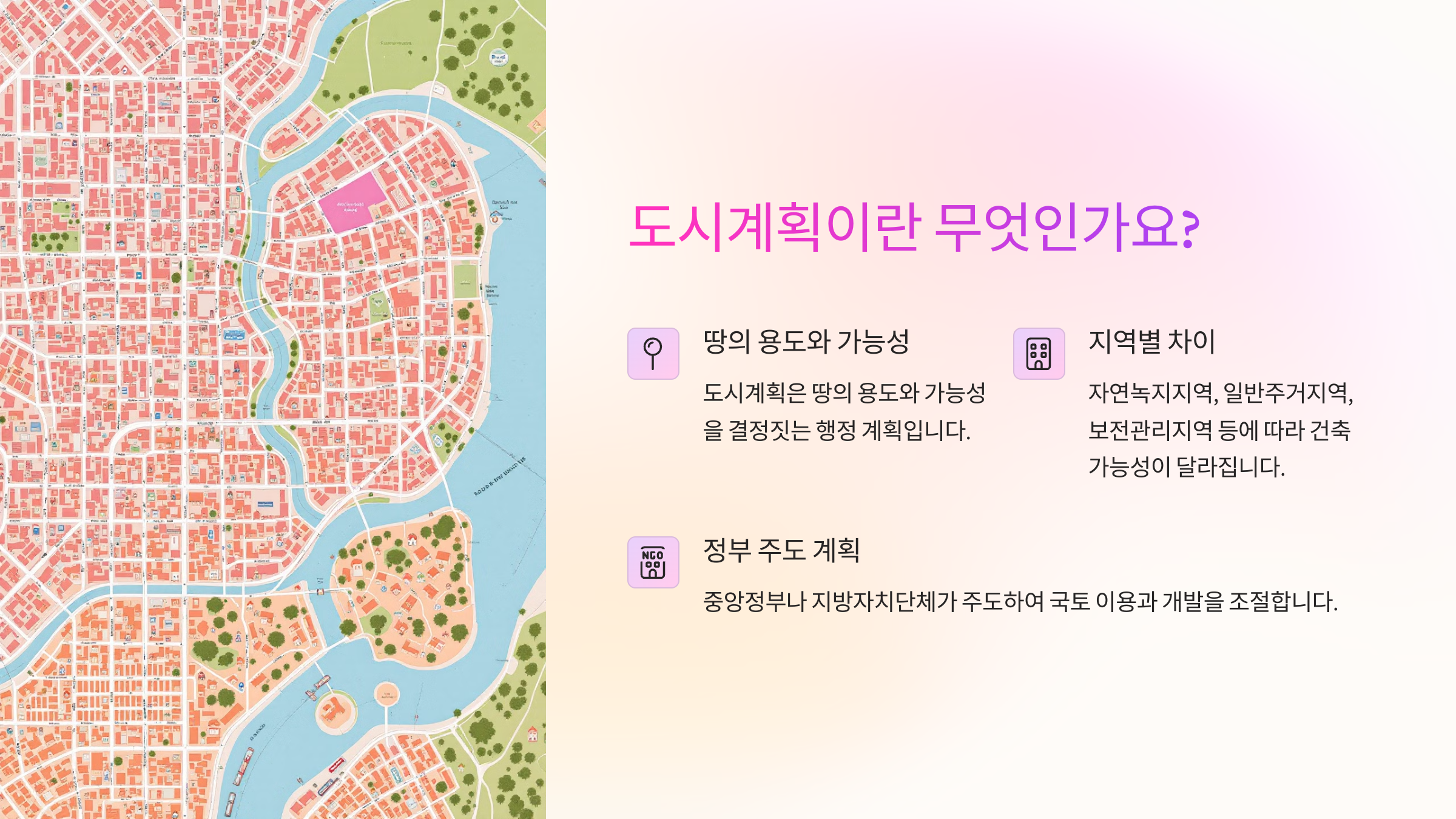도시계획은 한마디로 말해 ‘땅의 용도와 가능성’을 결정짓는 행정 계획이에요. 이 땅이 어떤 지역에 속해 있는지, 어떤 용도로 쓸 수 있는지, 향후 어떤 변화가 예정돼 있는지를 전부 담고 있는 것이죠. 도시의 성장과 질서 있는 개발을 위해 법적 근거에 따라 체계적으로 수립돼요.