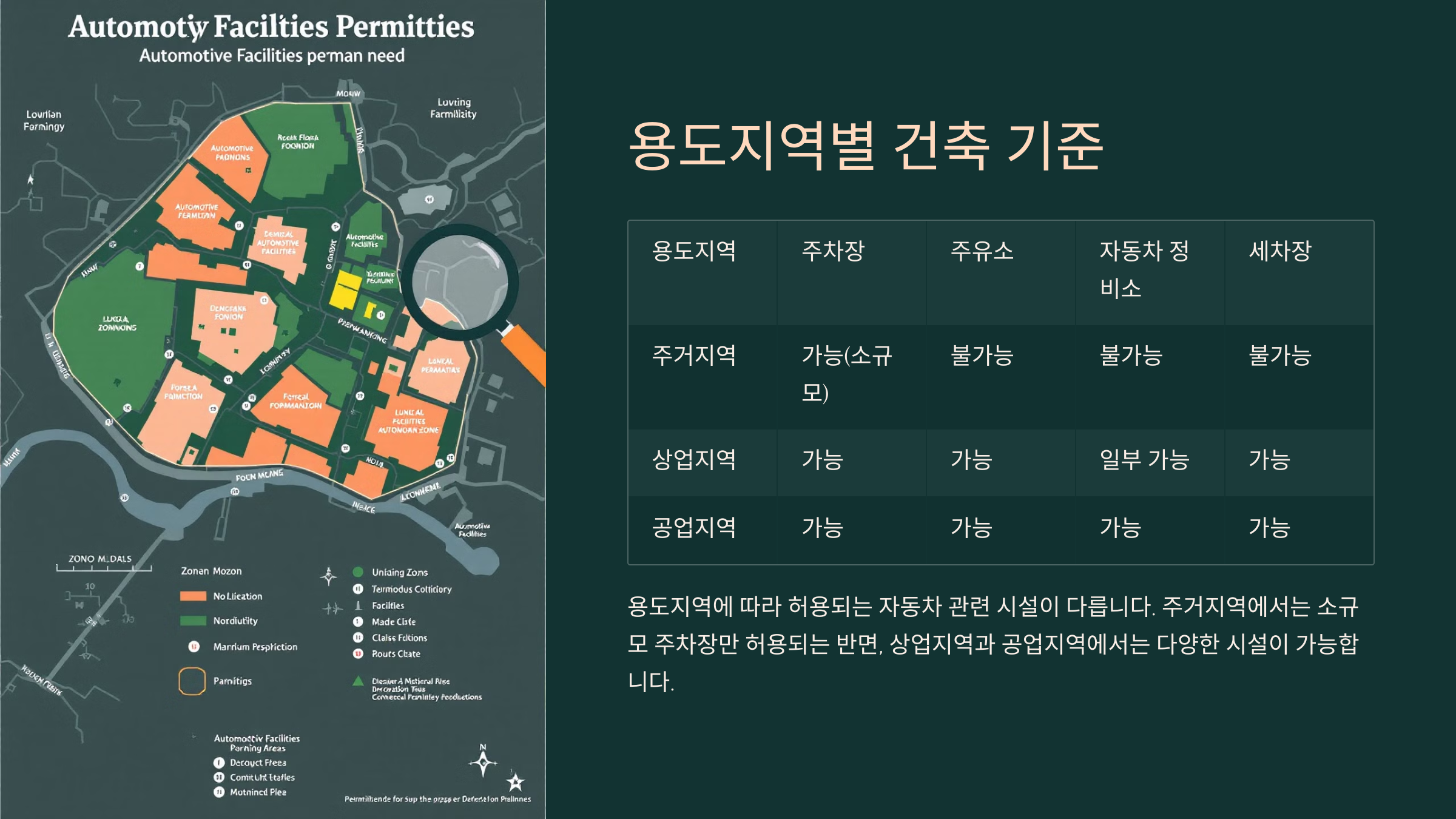 이처럼 용도지역에 따라 자동차 관련 시설이 설치 가능한 곳과 불가능한 곳이 나뉘어요. 특히 정비소나 주유소 같은 시설은 주거지역에서는 제한을 받는 경우가 많죠.