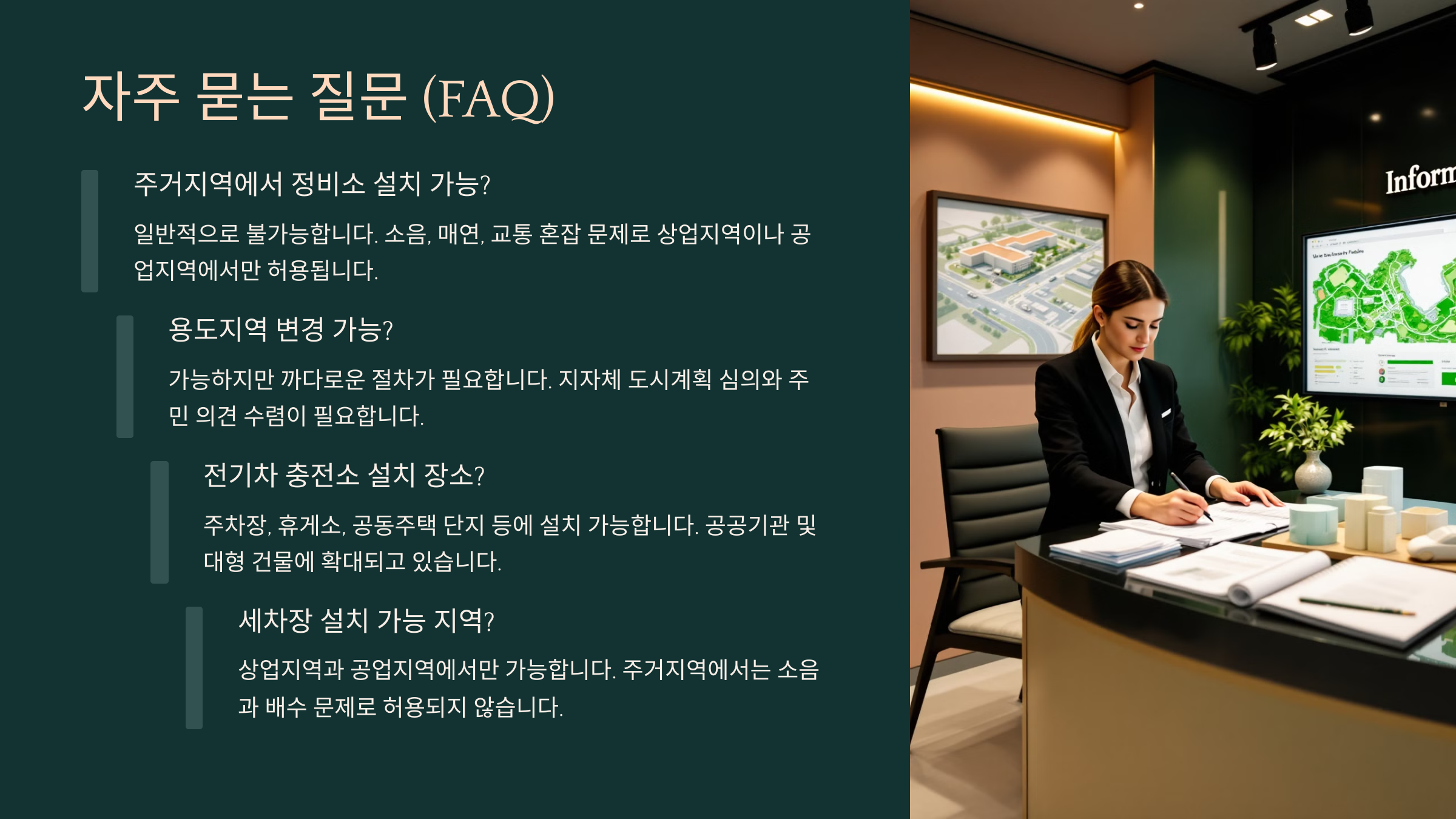 Q1. 주거지역에서도 자동차 정비소를 설치할 수 있나요?