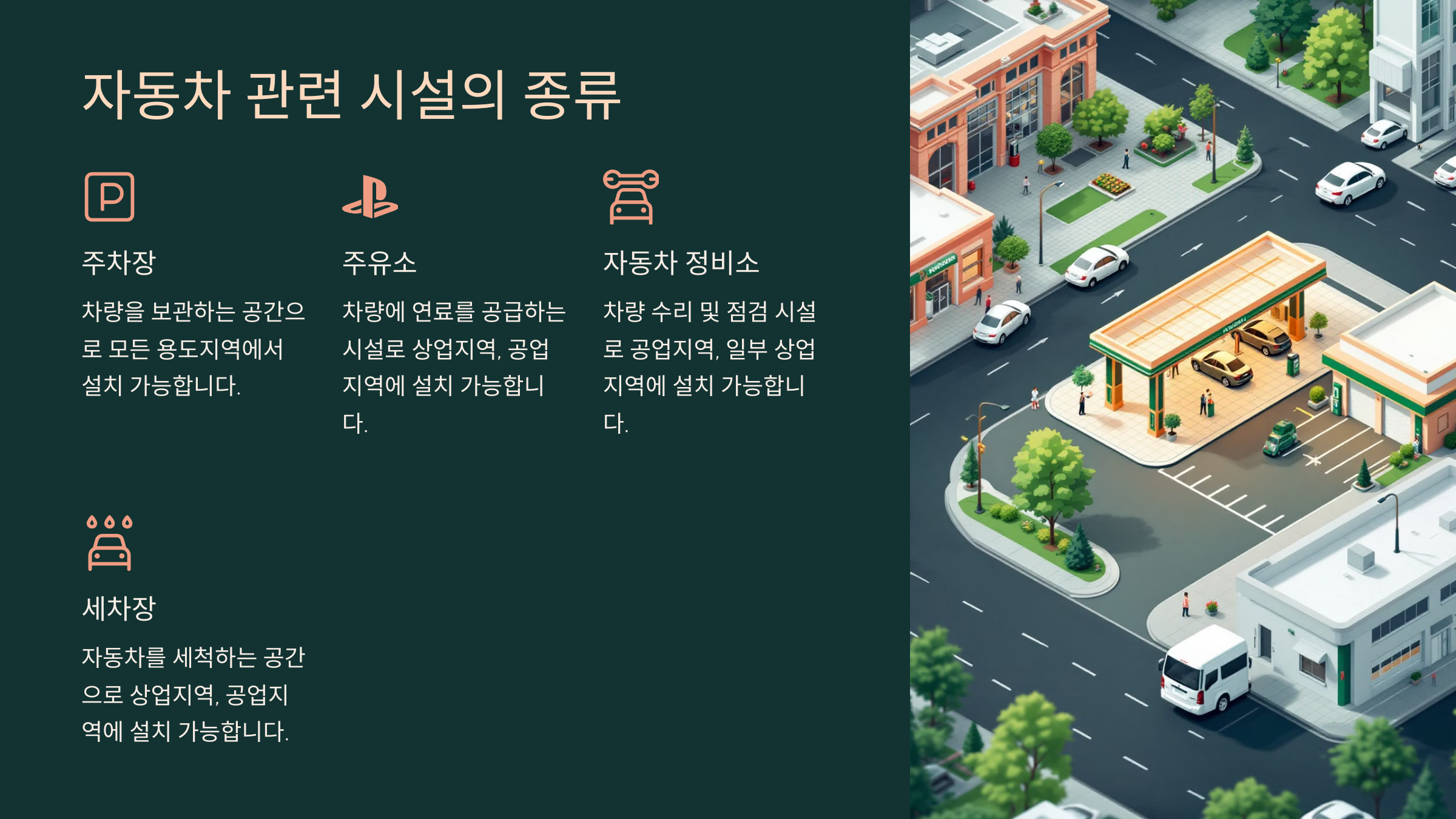 자동차 관련 시설은 도시의 필수 인프라 중 하나예요. 주차장, 주유소, 정비소 같은 시설은 특정 용도지역에서만 허용되거나, 건축 기준에 따라 설치할 수 있죠.