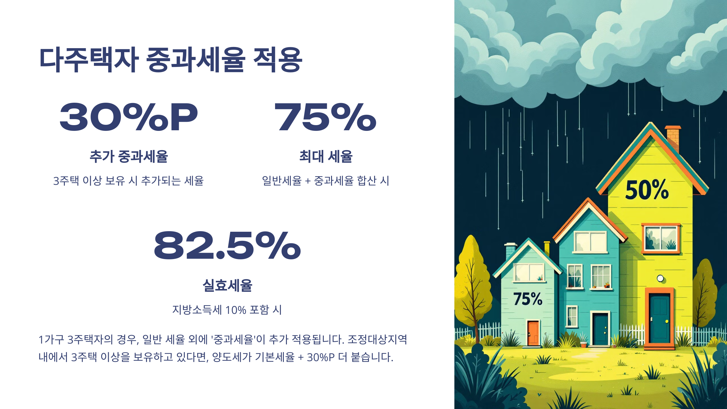 이런 중과세율은 조정지역 여부, 주택 수, 보유 기간 등에 따라 조금씩 달라질 수 있어요.