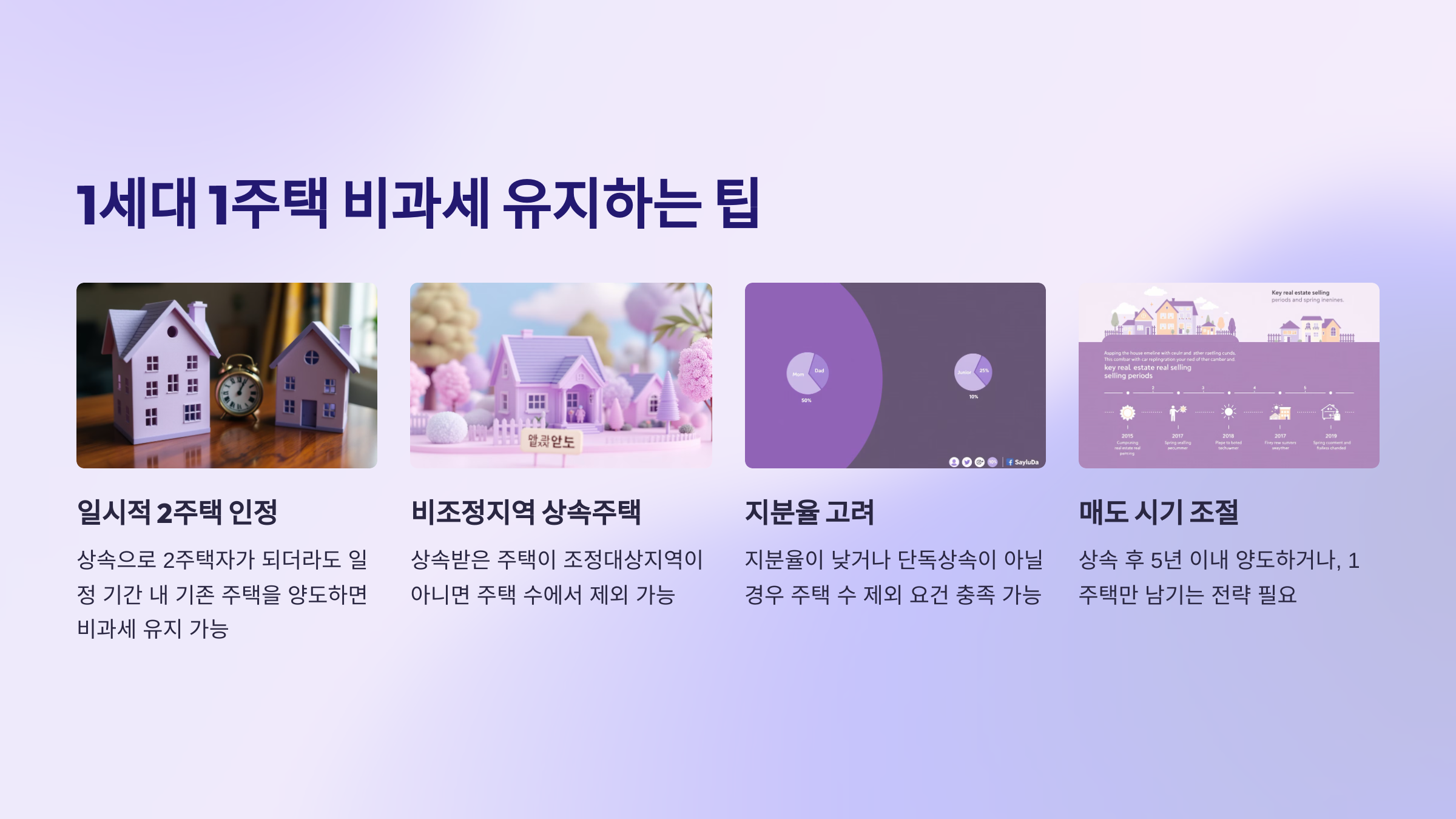 3️⃣ 비과세 요건 충족 시점 만약 상속주택을 보유 주택으로 가져가고 싶다면, 2년 이상 실거주 → 1세대 1주택 조건을 갖춘 뒤 매도해야 양도세 비과세 혜택을 받을 수 있어요. 급하게 팔면 양도세 중과 적용될 수 있으니 주의!