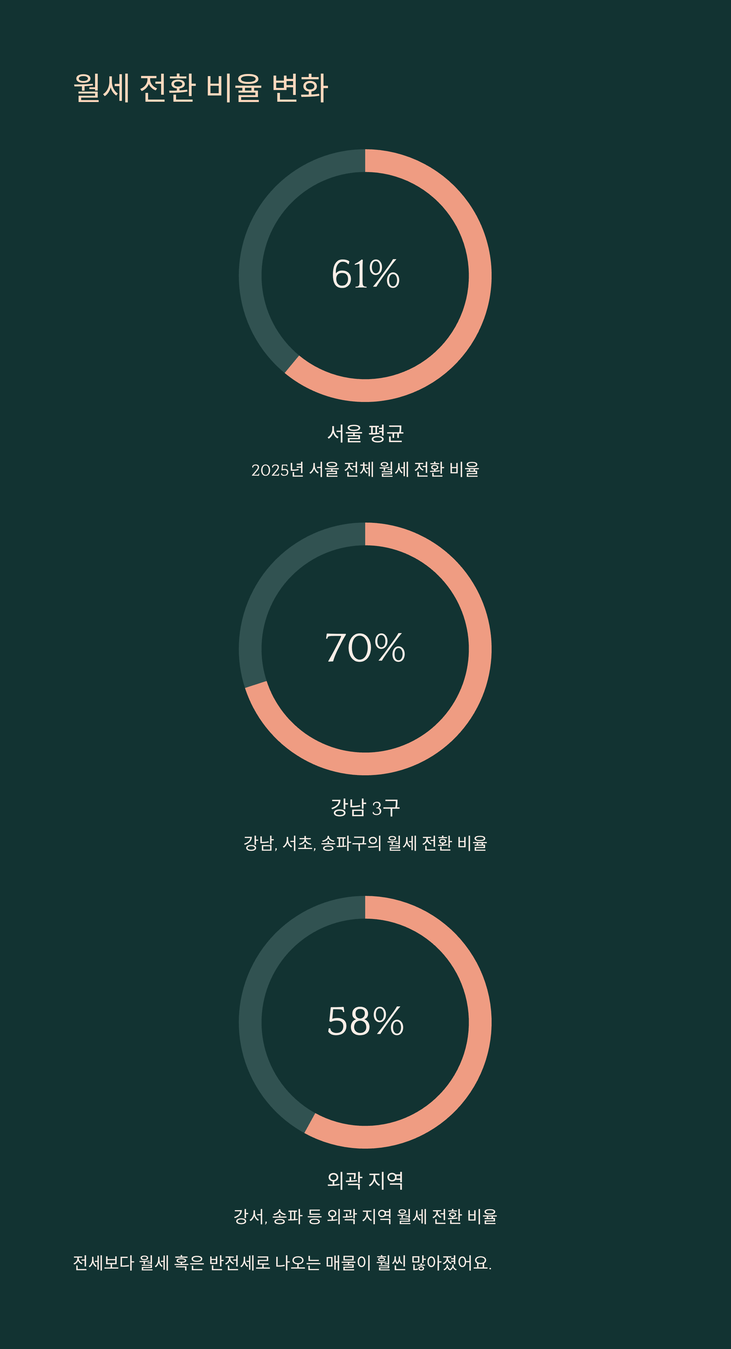 2025년 들어 서울 전체의 월세 전환 비율은 60%를 넘어섰어요. 특히 강남 3구는 이 비율이 70%에 달해요. 전세보다 월세 혹은 반전세로 나오는 매물이 훨씬 많아졌다는 뜻이에요. 전세 계약 자체를 구하기가 하늘의 별따기라는 말이 나올 정도예요.