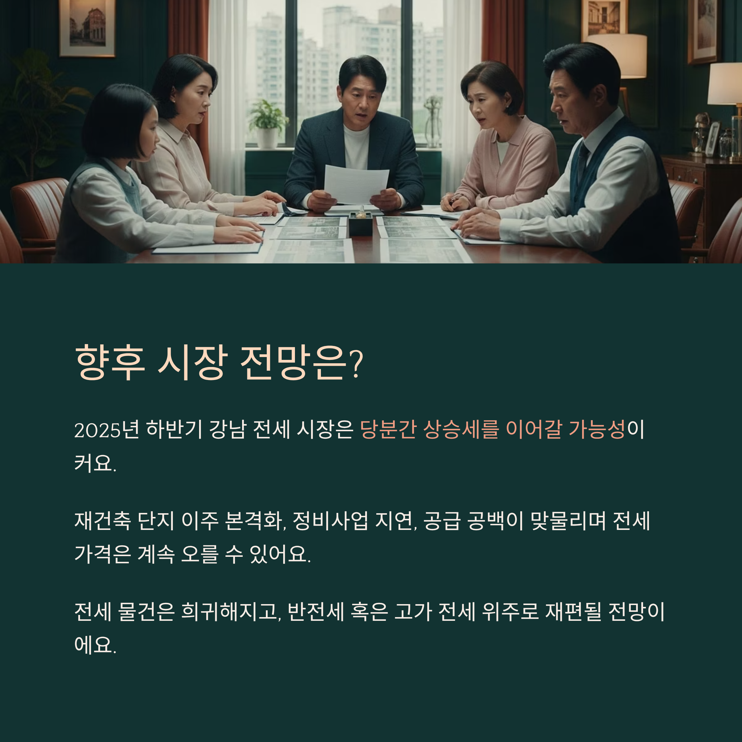 2025년 하반기 강남 전세 시장은 당분간 상승세를 이어갈 가능성이 커요. 특히 재건축 단지들의 이주 본격화, 정비사업 지연, 공급 공백이 복합적으로 맞물리면서 전세 가격은 계속 오를 수 있어요. 전세 물건은 희귀해지고, 반전세 혹은 고가 전세 위주로 재편될 전망이에요.