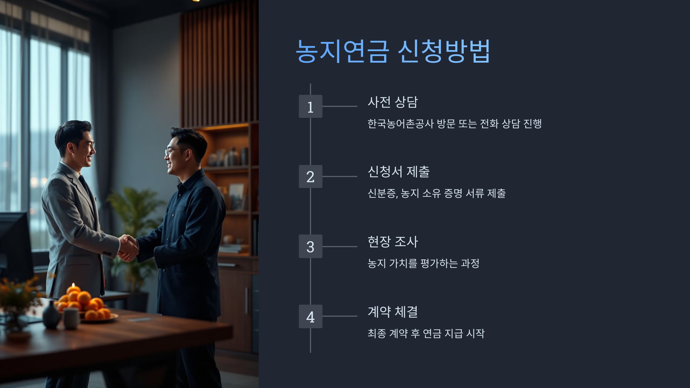 농지연금 신청은 온라인과 오프라인으로 가능해요. 기본적인 절차는 다음과 같아요.
