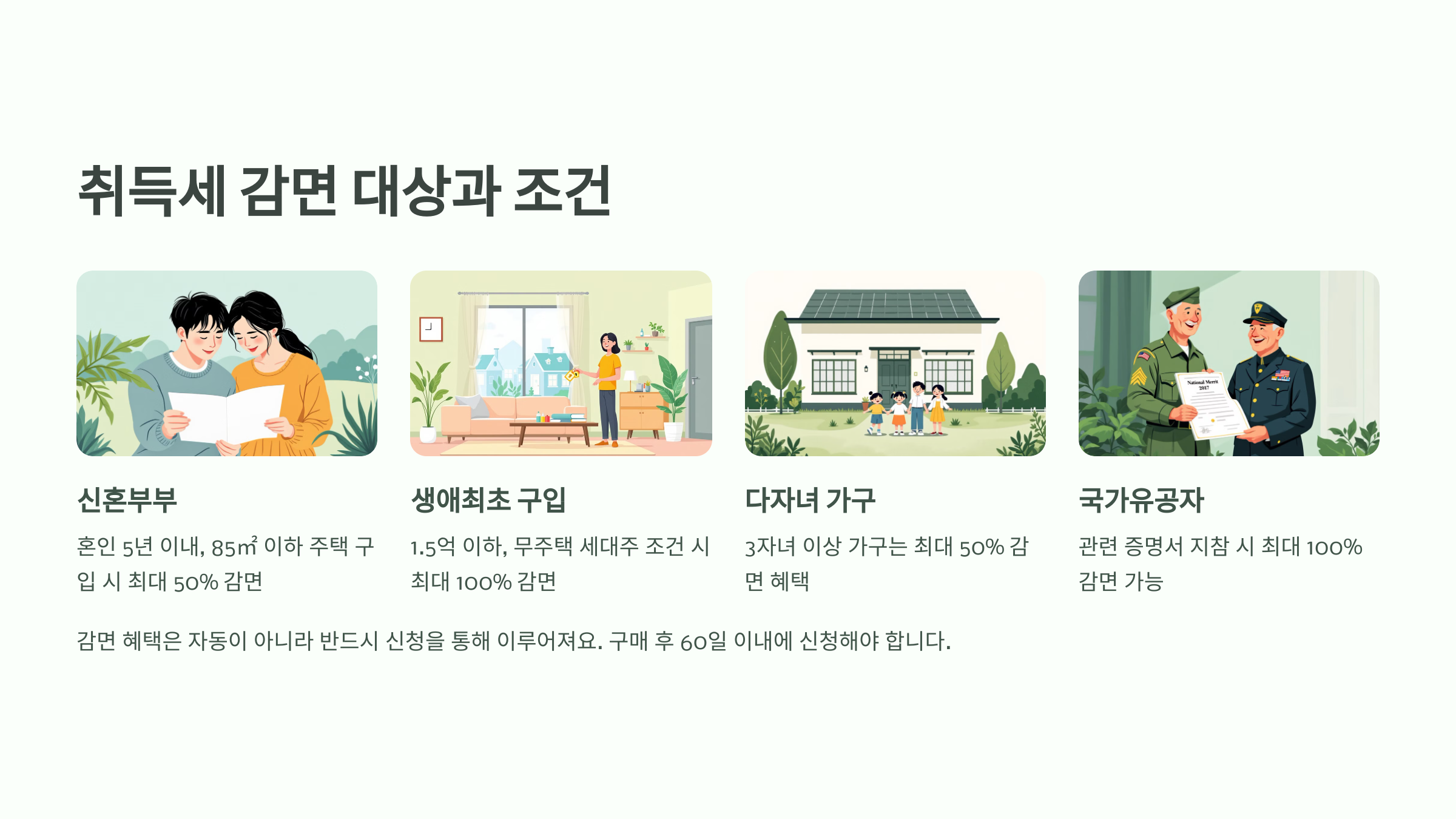 대표적으로 신혼부부, 생애최초 주택 구입자, 다자녀 가구, 장애인, 국가유공자, 농어촌 이주자 등이 감면 대상이에요. 감면율도 케이스에 따라 50%부터 100%까지 다양해요.