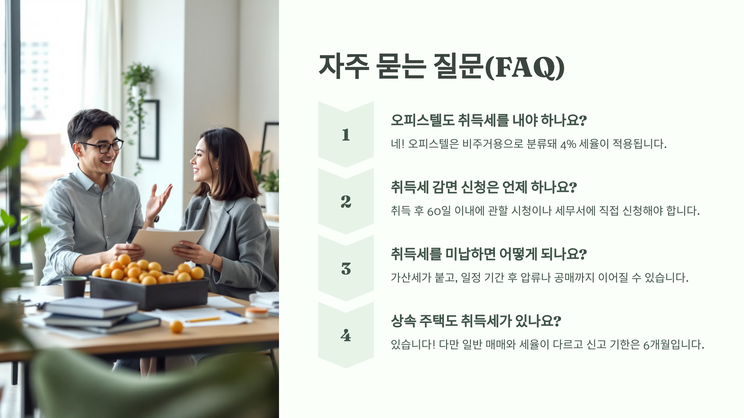 A1. 네! 오피스텔은 비주거용으로 분류돼서 4% 세율이 적용돼요. 주택 수에도 포함되지 않지만, 취득세는 반드시 내야 해요.