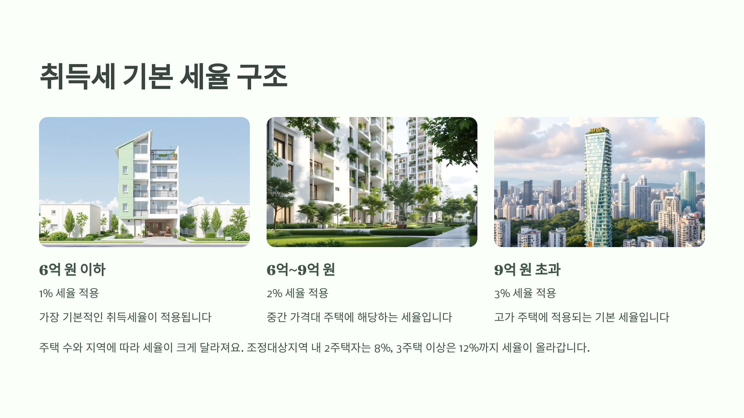 예를 들어, 주택의 경우는 실거래가 또는 시가표준액을 기준으로 취득가액이 6억 원 이하일 때 1%, 6억~9억 원 사이는 2%, 9억 원 초과 시 3%예요. 이건 1주택 보유자 기준이에요!