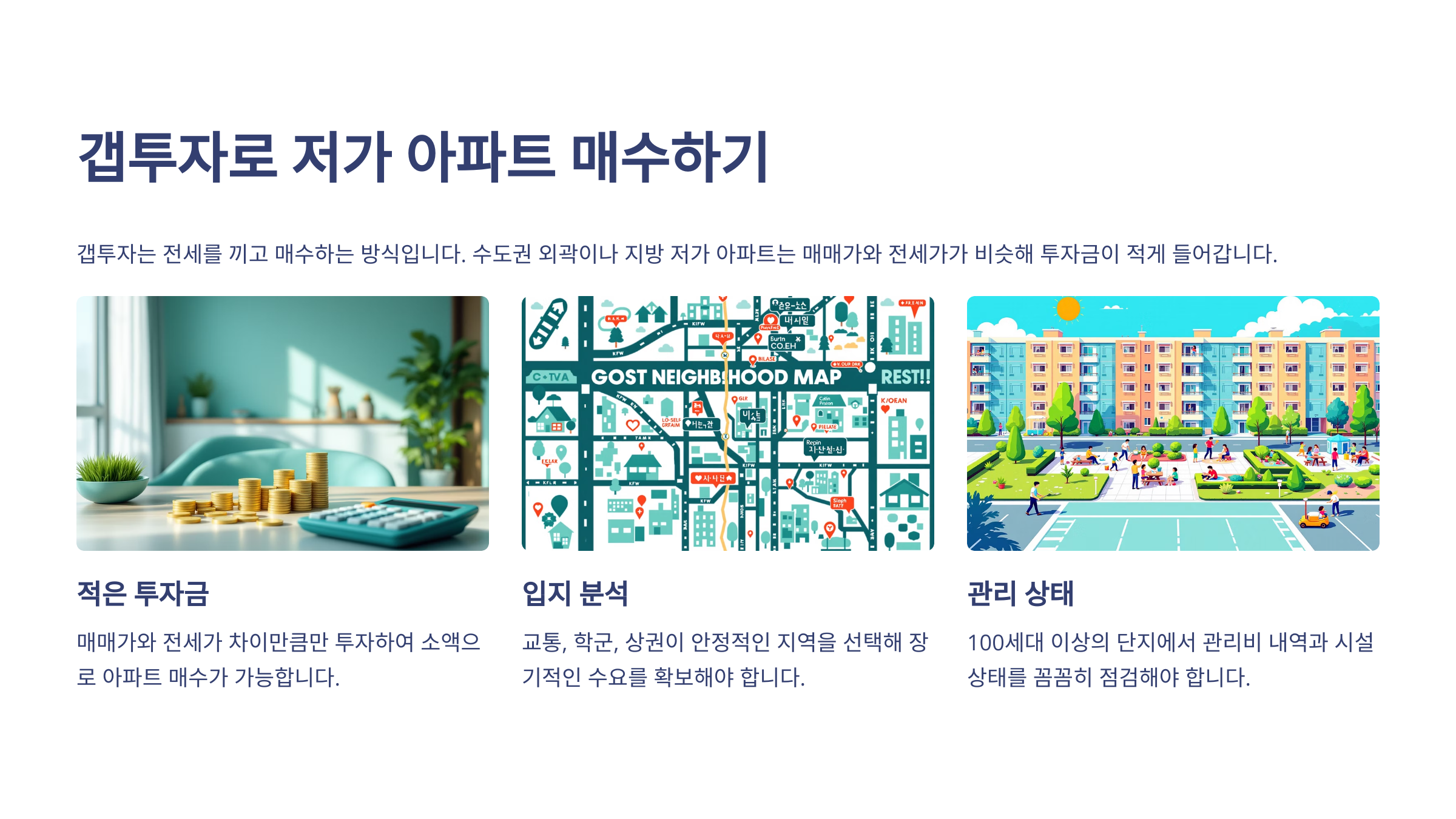 갭투자는 투자금 대비 수익률이 높은 대신 리스크 관리가 필수라서 초보자는 신중하게 접근해야 해요.