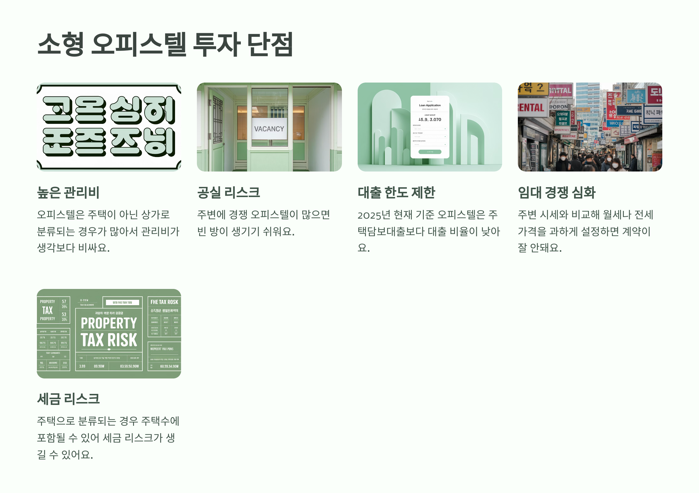 소형 오피스텔 투자에도 분명히 단점과 리스크가 존재해요. 장점만 보고 무작정 투자하면 낭패를 볼 수도 있어요. 그래서 꼭 미리 알아두고 대비하는 게 중요해요.