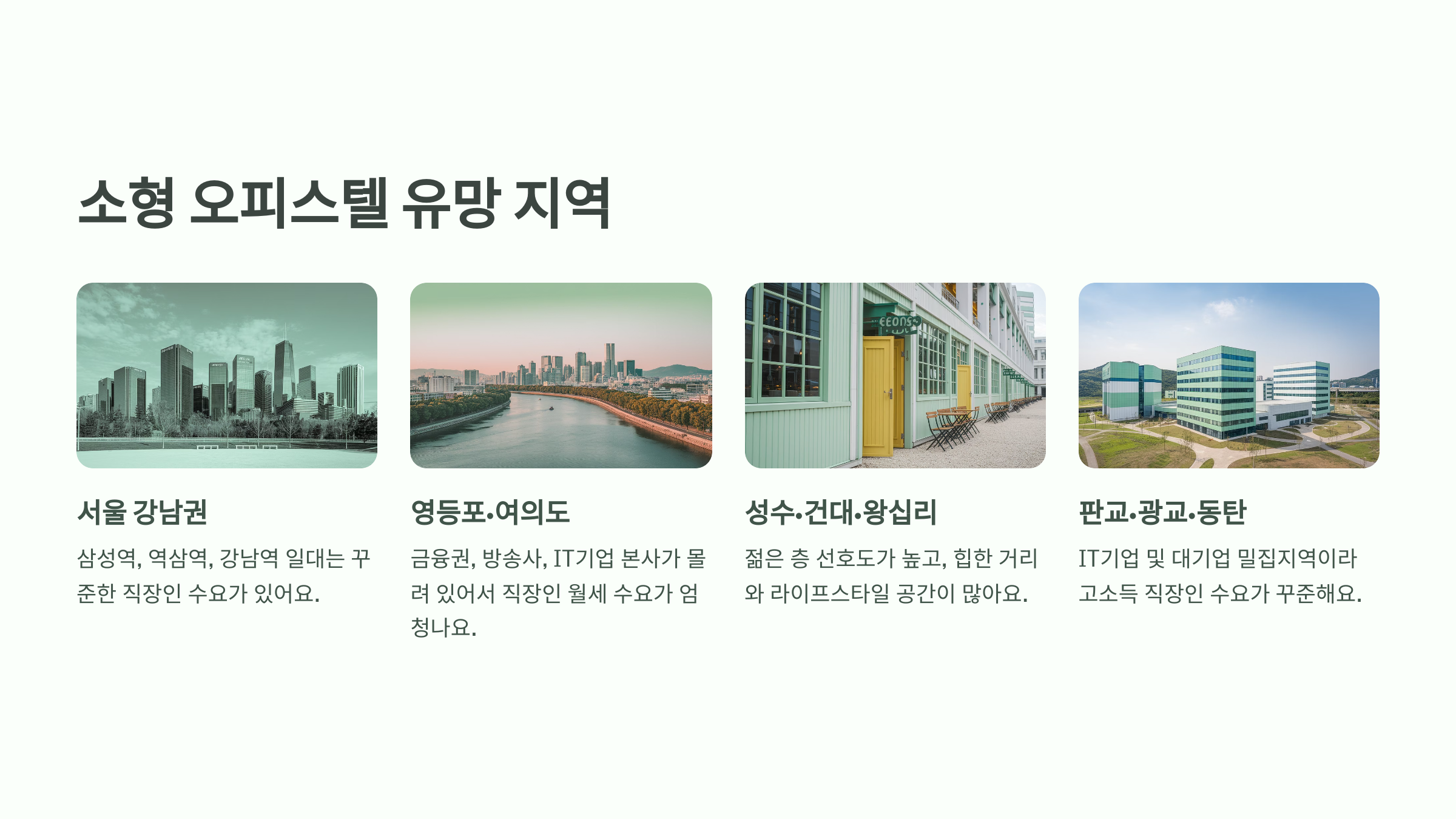 | 성수·건대 | 젊은 층, 트렌디 지역 | 20~30대, 프리랜서 |