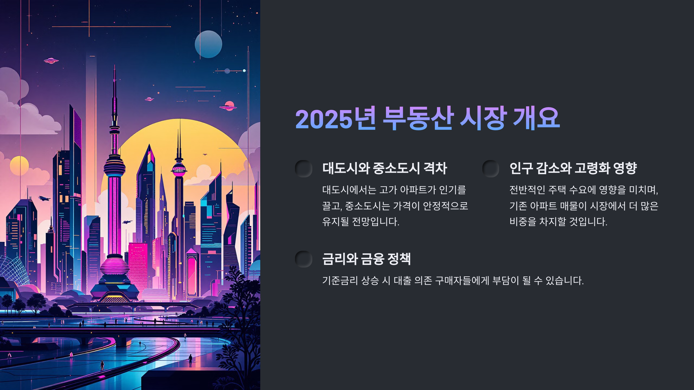 2025년의 부동산 시장은 글로벌 경기 회복과 맞물려 약간의 변동성을 보일 것으로 예상되고 있어요. 특히 대도시와 중소도시 간의 아파트 매매 수요와 공급 격차는 점차 심화될 가능성이 커요. 대도시에서는 여전히 고가의 아파트가 인기를 끌고 있지만, 중소도시에서는 가격이 안정적으로 유지되거나 약간의 하락세를 보일 전망이에요.