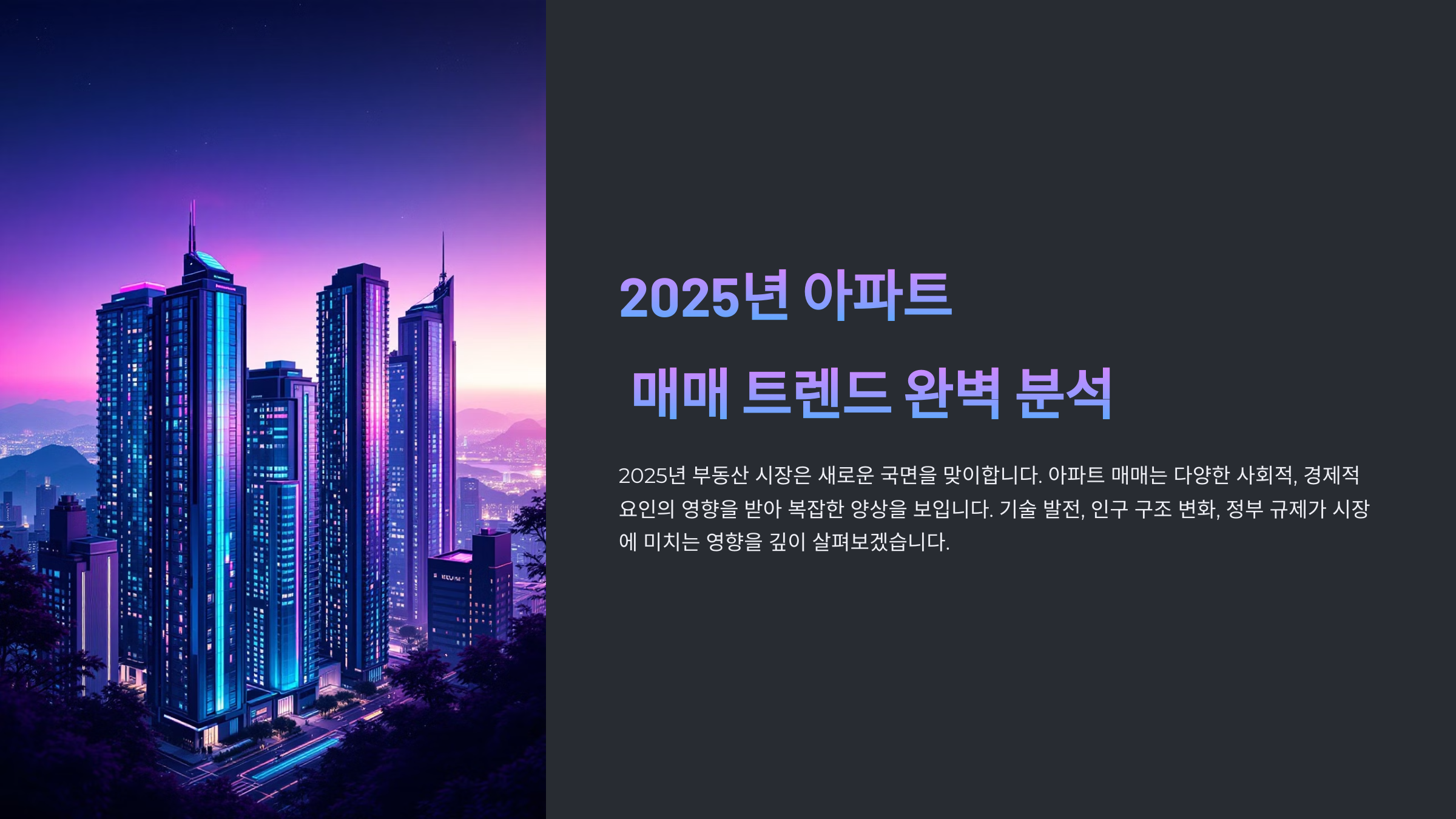 2025년은 부동산 시장이 새로운 국면을 맞이하는 해로 주목받고 있어요. 아파트 매매는 특히 다양한 사회적, 경제적 요인의 영향을 받아 복잡한 양상을 보이고 있죠. 기술 발전, 인구 구조 변화, 그리고 정부의 규제가 어떻게 시장에 영향을 미치는지 깊이 살펴보는 것이 중요해요.