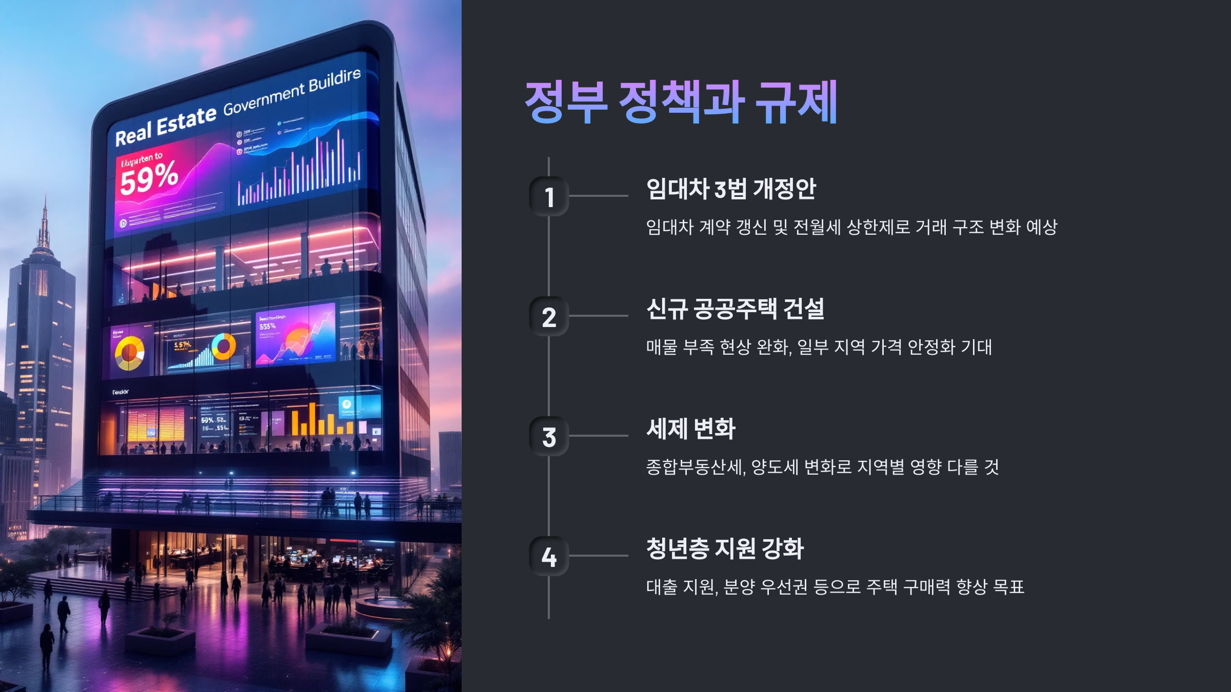 2025년에는 정부 정책이 아파트 매매 시장에 미치는 영향이 클 것으로 보여요. 특히 임대차 3법과 관련된 개정안이 논의되면서, 시장 전반에 큰 변화를 가져올 가능성이 높아요. 임대차 계약 갱신 및 전월세 상한제는 세입자와 집주인 간의 거래 구조를 변화시킬 것으로 예상돼요.