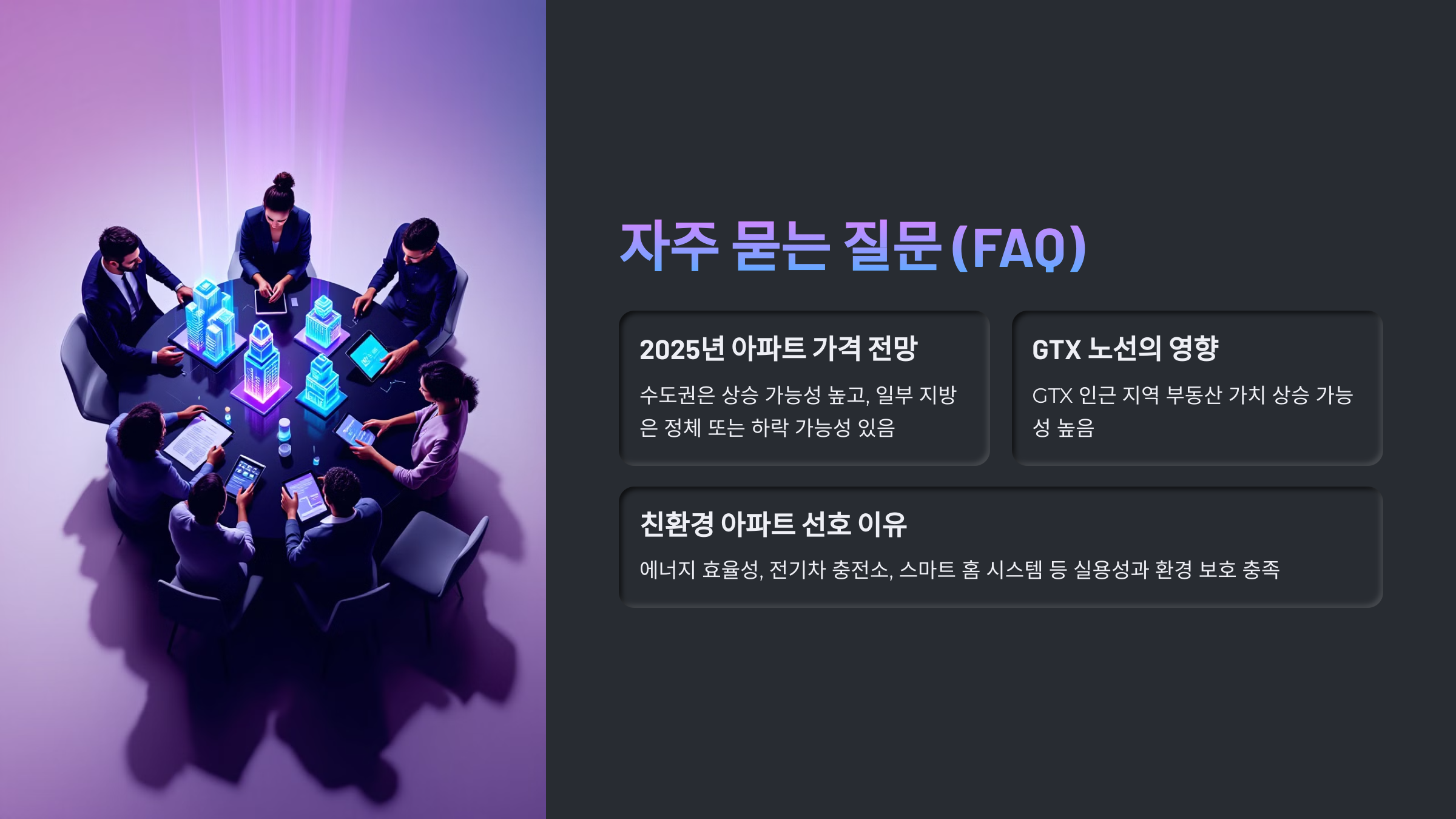 또한, 2025년에는 친환경 정책이 주택 시장에 중요한 변수가 될 것으로 보이는데요. 에너지 효율이 높은 아파트가 점점 더 많은 소비자들에게 선호되며, 이러한 건물들은 비교적 높은 가격을 유지하거나 더 상승할 가능성이 있어요. 전기차 충전소와 같은 친환경 시설의 유무가 아파트 가치를 결정짓는 주요 기준 중 하나로 자리 잡고 있어요.