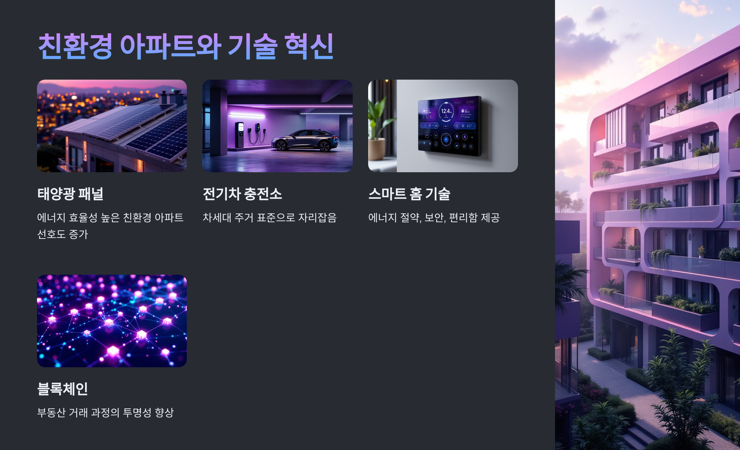 2025년 아파트 매매 트렌드에서 가장 두드러지는 변화 중 하나는 친환경 요소와 첨단 기술의 도입이에요. 에너지 효율성이 높은 친환경 아파트는 점점 더 많은 소비자에게 매력적인 선택지가 되고 있어요. 태양광 패널 설치, 스마트 홈 기술 등은 이러한 친환경 아파트의 주요 특징이에요.