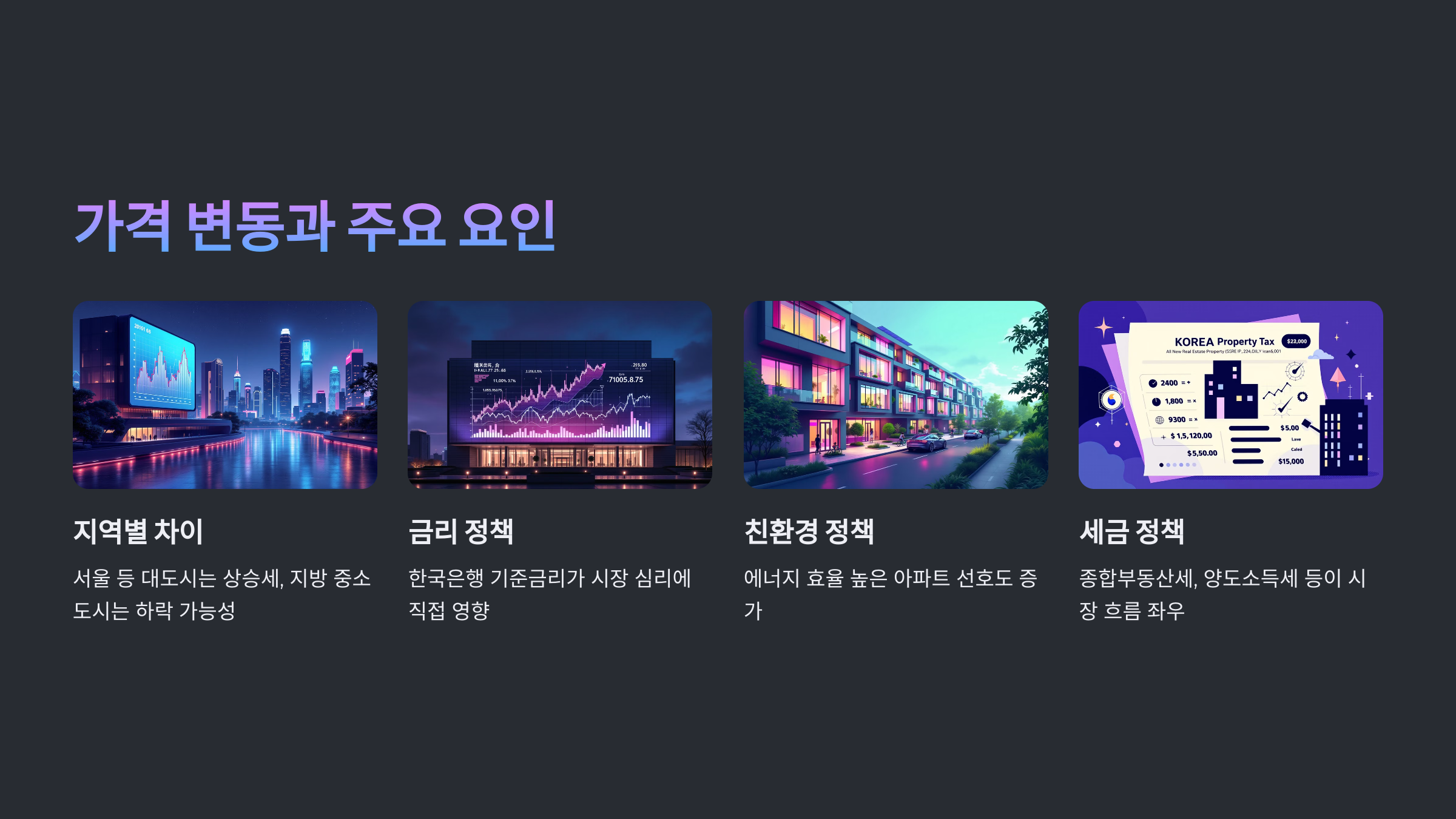 아파트 가격의 상승 또는 하락을 좌우하는 주요 요인 중 하나는 금리인데요. 한국은행의 기준금리 정책이 시장 심리에 직접적인 영향을 미치고 있어요. 금리가 상승하면 대출 이자가 높아져 구매 수요가 감소하고, 이는 아파트 가격 안정화 또는 하락으로 이어질 수 있어요.