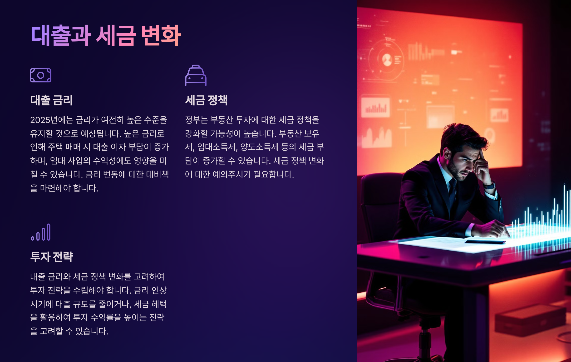 2025년 부동산 시장에서 대출 규제와 세금 변화는 중요한 변수예요. 최근 정부는 부동산 시장을 안정시키기 위해 대출 규제를 완화할 가능성이 크지만, 세금 부담은 여전히 클 수 있어요.
