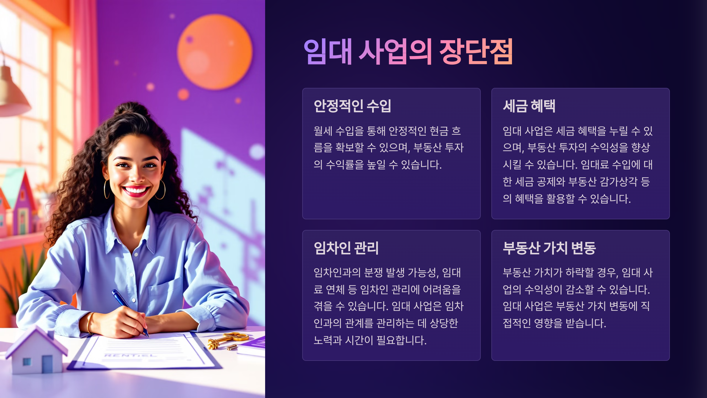임대 사업은 매달 꾸준한 수익을 창출할 수 있다는 점에서 안정적인 투자 방식이에요. 하지만 공실 위험과 유지 관리 비용이 발생할 수 있어 신중한 접근이 필요해요.