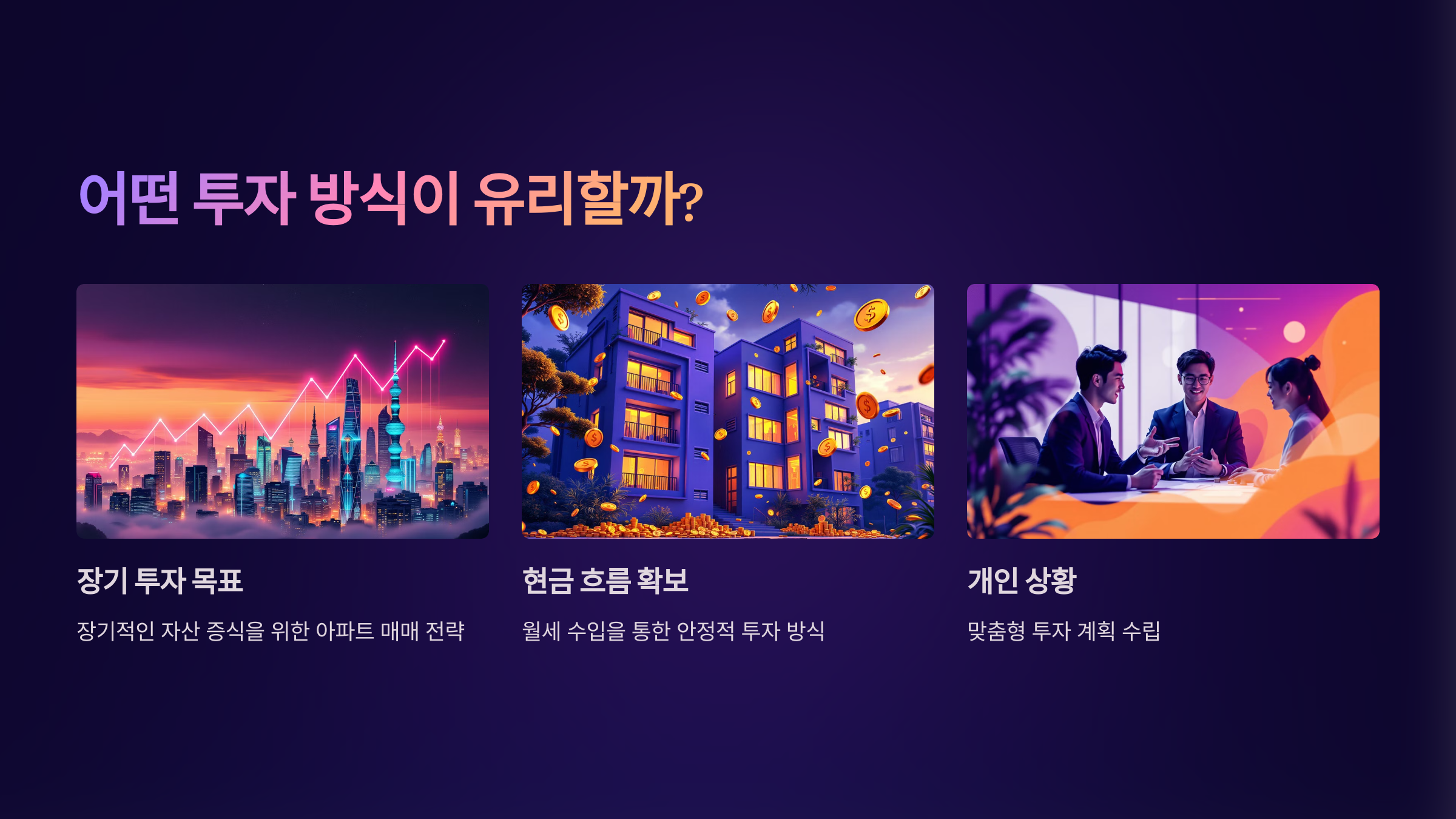 | 아파트 | 3~5% | 자산가치 상승 가능 | 초기 투자비용 높음 |