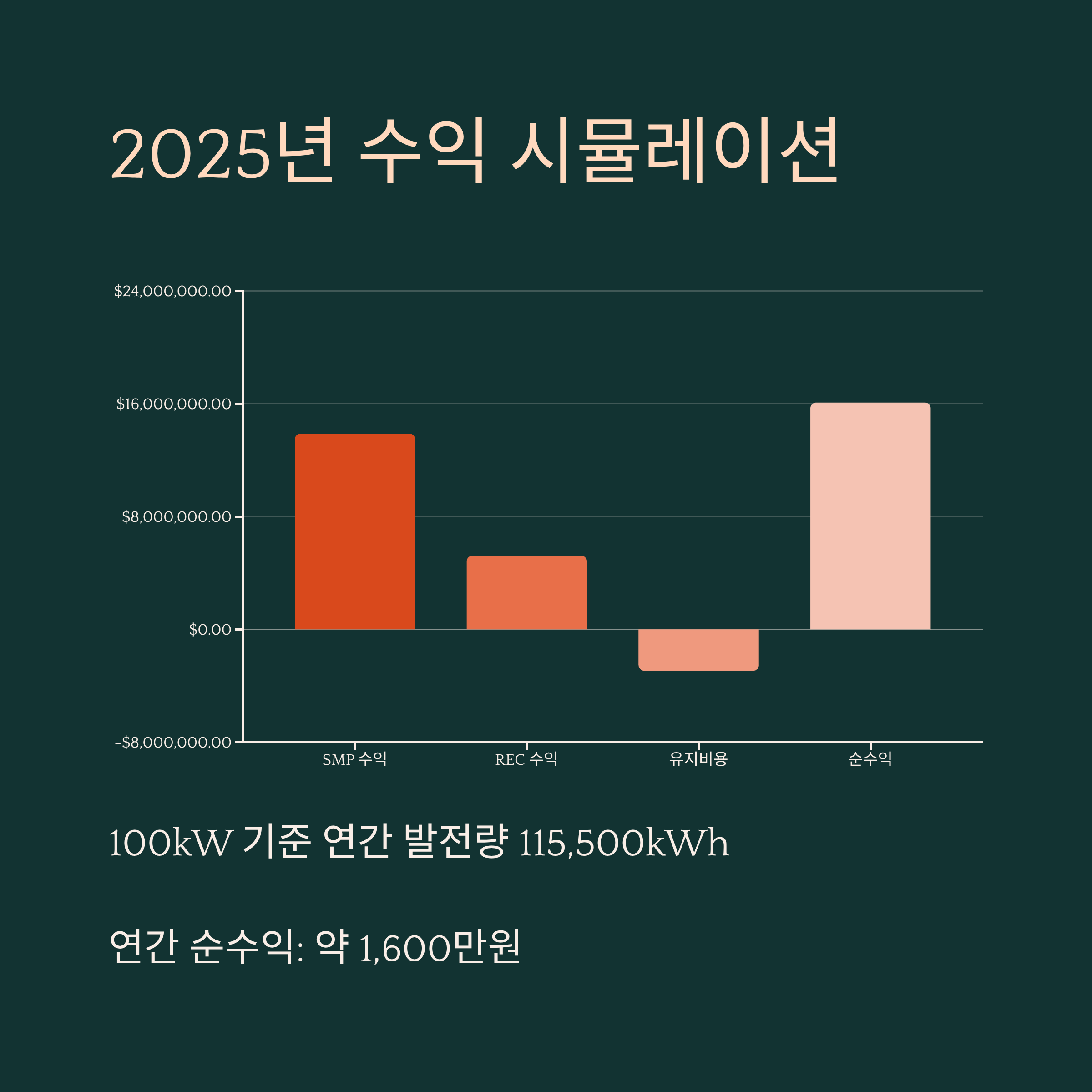 이 계산을 기준으로 하면 연간 예상 발전량은 약 115,500kWh이고, 총 수익은 약 1,905만 원(165원 × 115,500kWh)이 돼요. 여기서 유지비 300만 원과 계통 사용료 등을 제외하면 실제 수익은 1,600만 원대 중반이에요.
