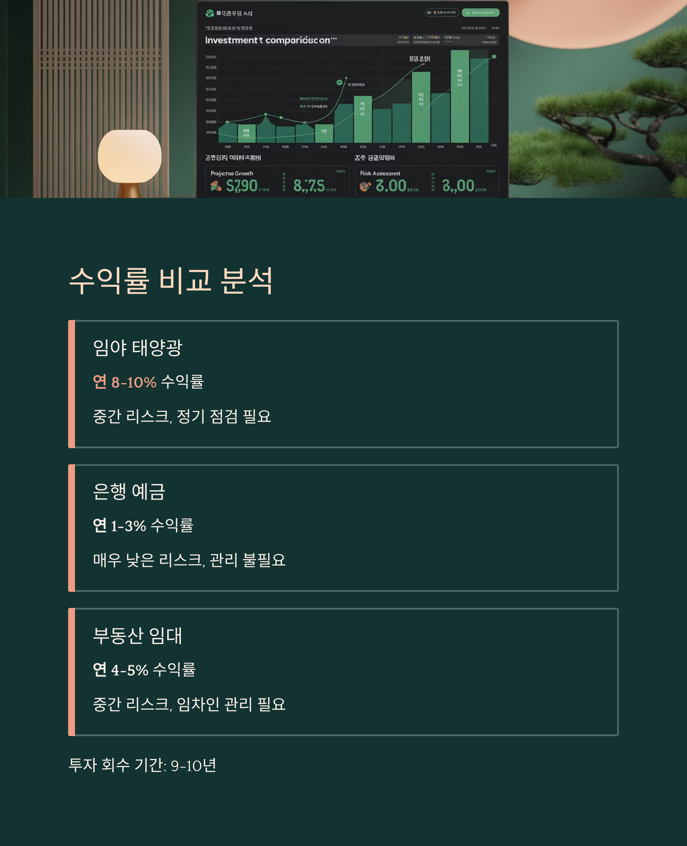2025년 기준 임야 태양광 수익률은 연 8~10% 수준으로 예측되고 있어요. 이는 은행 정기예금(연 3% 미만)이나 부동산 임대(연 4~5%)보다 높은 수치예요. 수익률은 설치 지역의 일조량, 발전소 방향, 설비 효율 등에 따라 달라져요.
