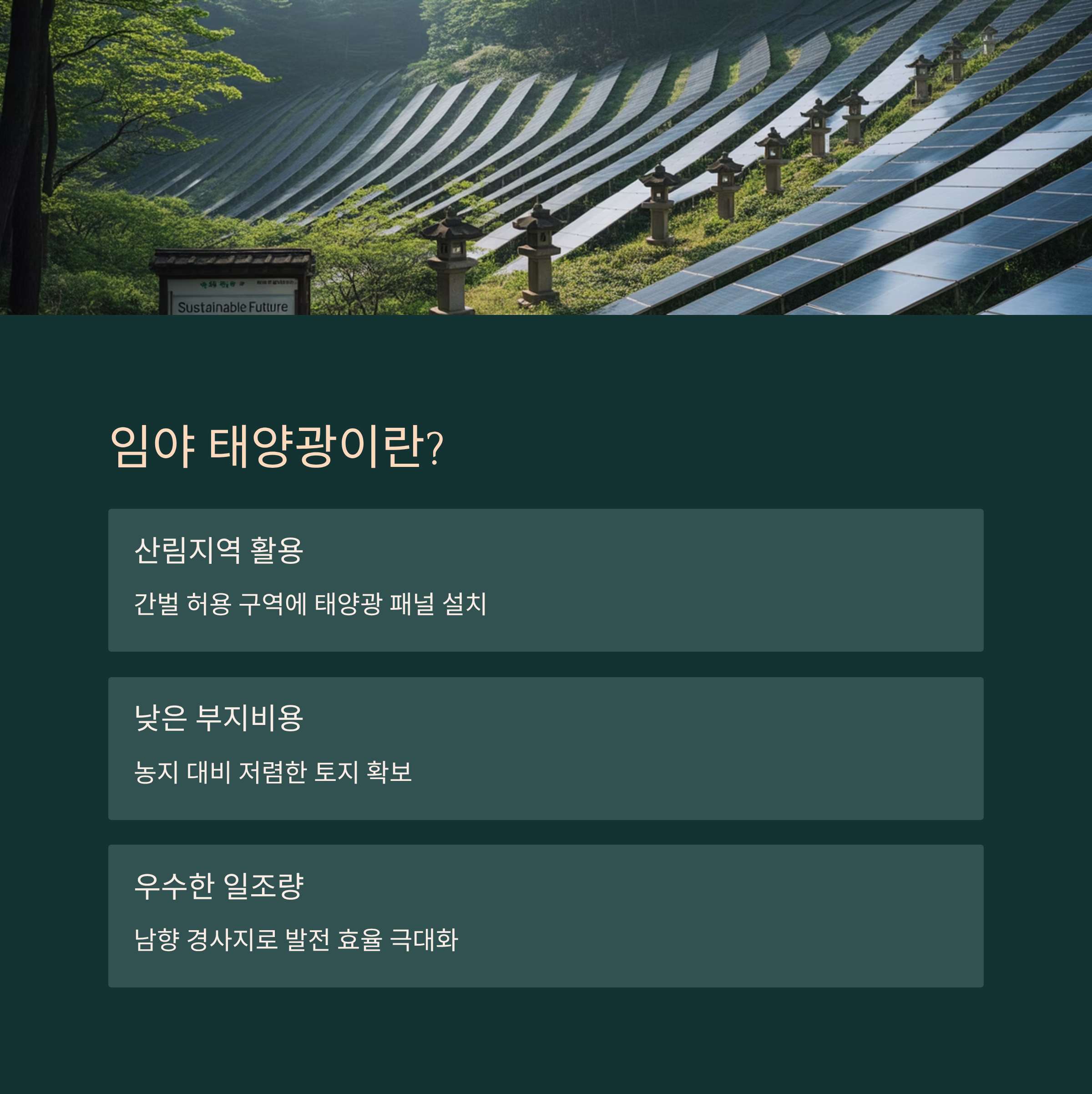임야 태양광 발전은 산림지역 중 일정한 간벌이나 벌채가 허용되는 구역을 활용해 태양광 패널을 설치하는 방식을 말해요. 일반적인 농지보다 부지 비용이 낮고, 지가 상승 가능성도 있어 투자자들 사이에서 인기가 높아지고 있어요.