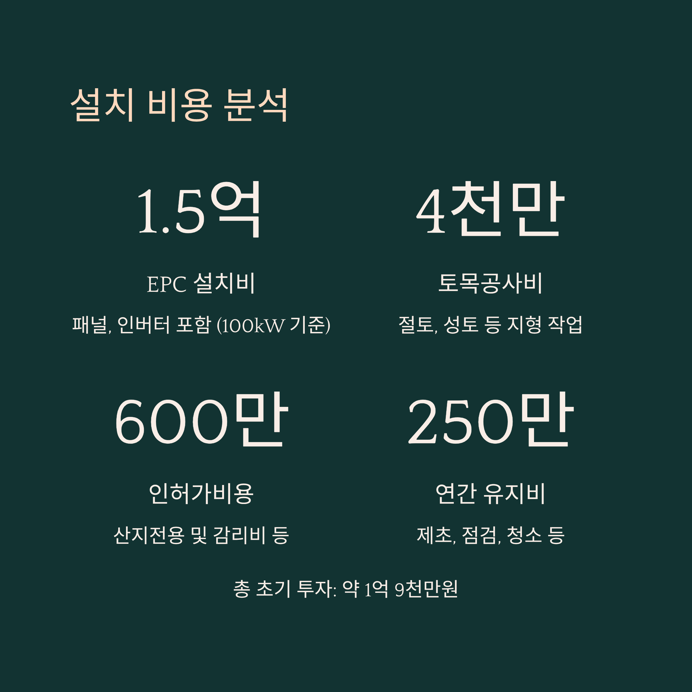 | EPC 설치비 | 1억 2천 ~ 1억 5천만 원 | 패널, 인버터 포함 |