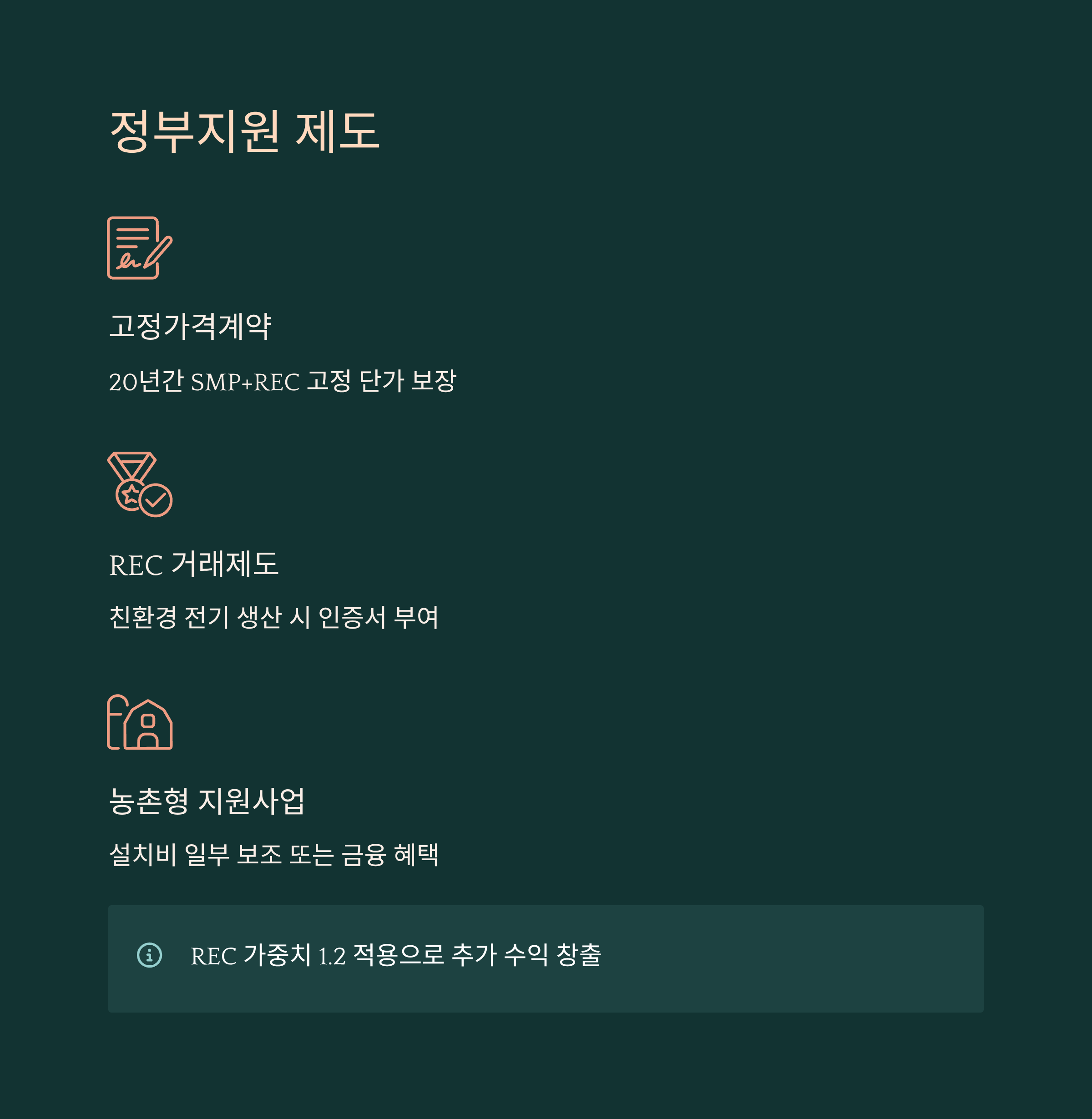 | 농촌형 태양광 지원사업 | 설치비 일부 보조 또는 금융 혜택 | 농림축산식품부 |