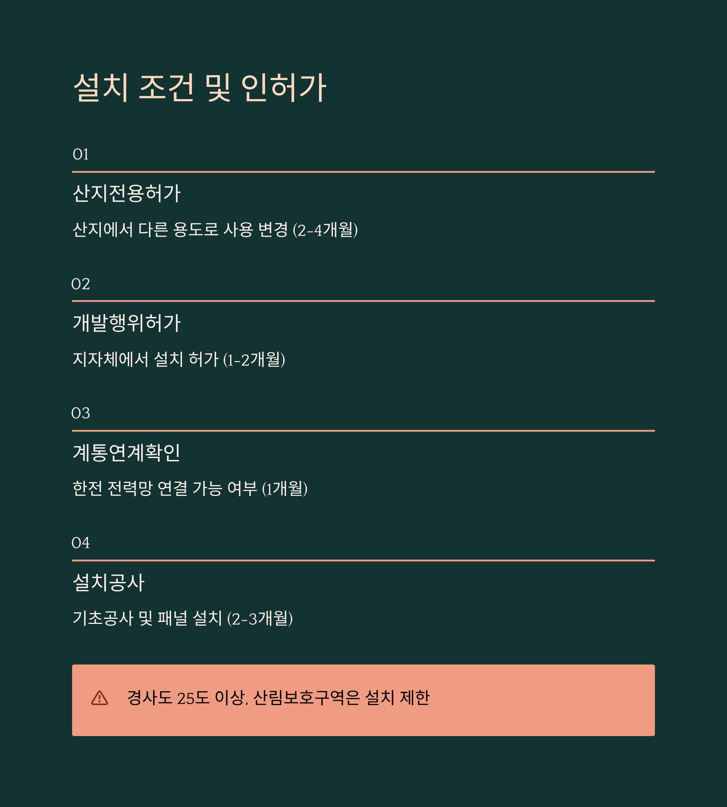 다만, 설치 과정에서는 산지전용 허가, 벌채 허가 등 다양한 인허가 절차를 거쳐야 하고, 법적 제약 사항도 많기 때문에 꼼꼼한 사전 준비가 필요해요.