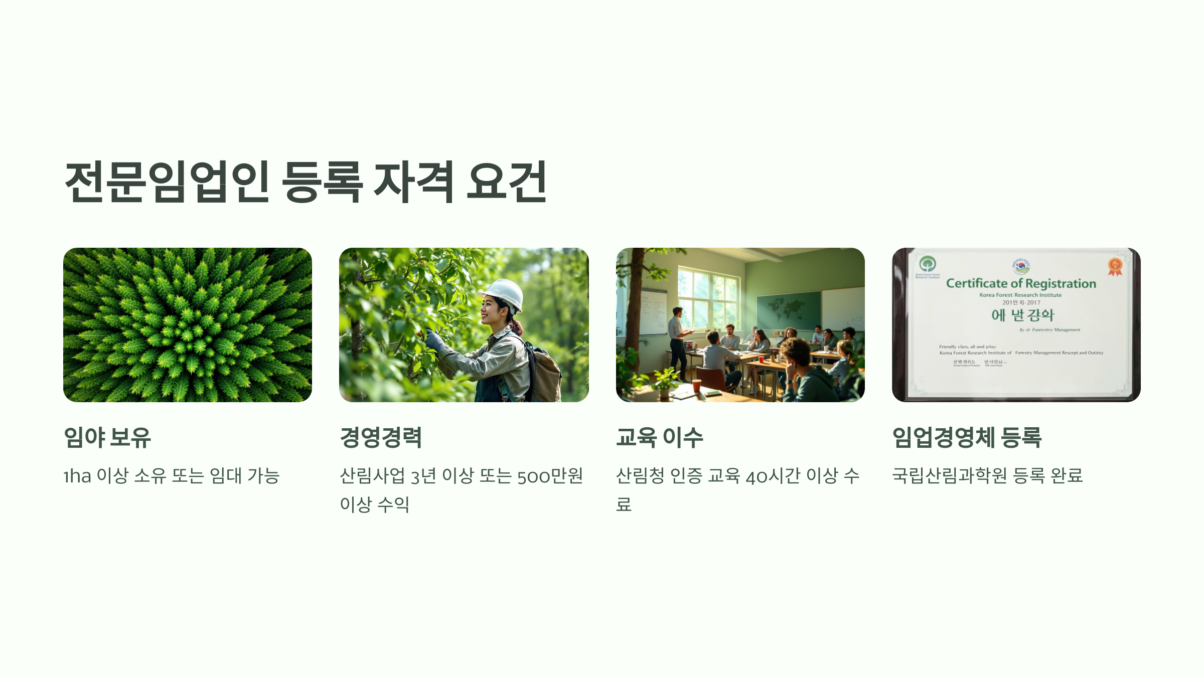 전문임업인 등록 조건은 기본적으로 '임업경영체 등록'이 되어 있어야 하고, 일정 면적 이상의 임야 보유 또는 산림 관련 사업 운영 경험이 필요해요.