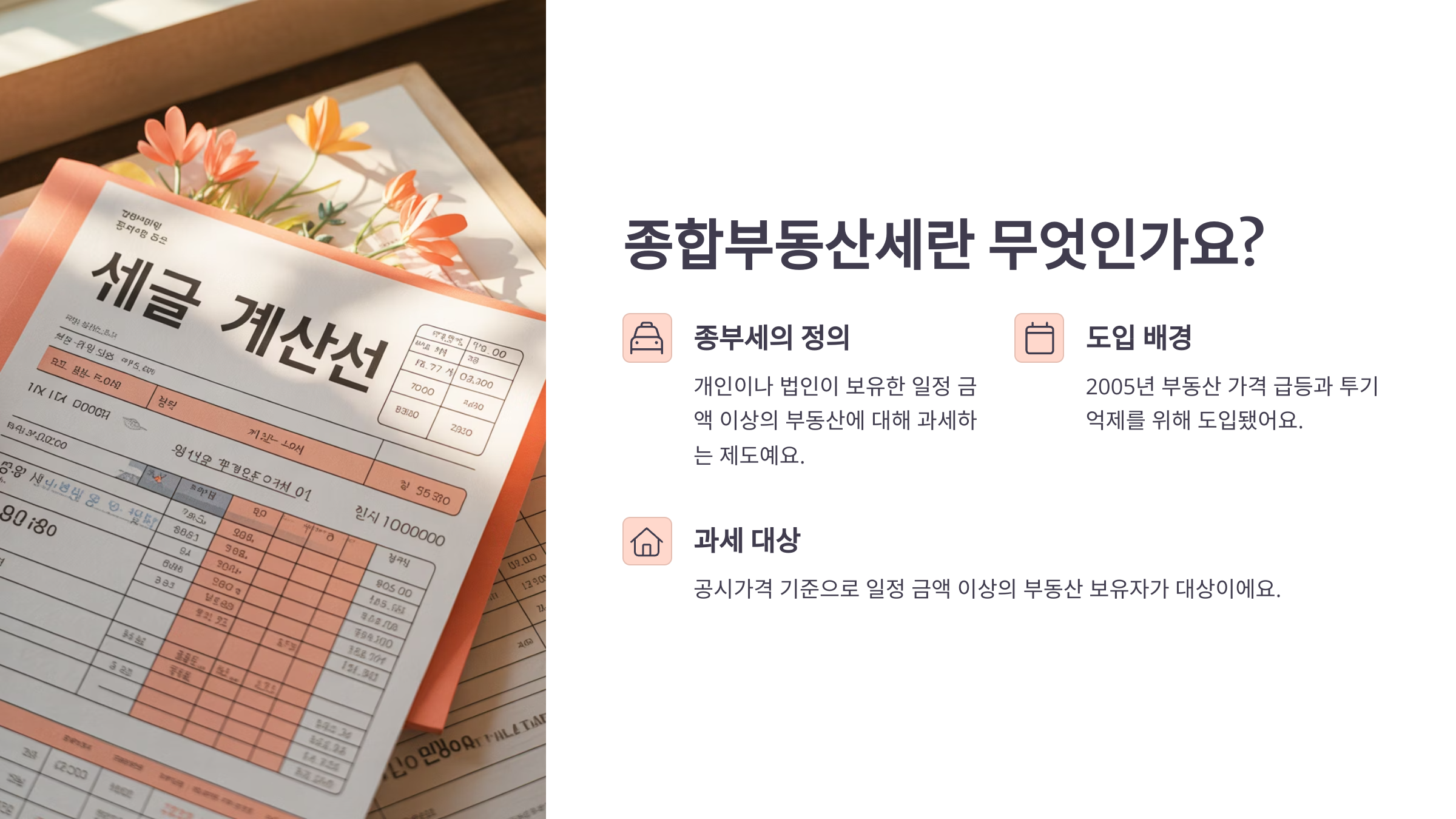 종합부동산세는 일정 기준을 초과한 고가의 부동산 보유자에게 부과되는 세금이에요. 흔히 ‘종부세’라고 불리며, 부동산 자산을 많이 보유한 사람일수록 높은 세율을 적용받게 되죠. 부동산 시장의 안정과 세수 확보를 위한 대표적인 조세 정책 중 하나예요.
